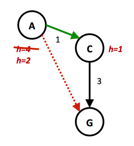 • \(h(A) = h(B) = 0\):我们已经假设启发式算法已经满足了可容纳性限制,而且 \(A, B\) 均为目标状态,那么 \(A, B\) 的真正的最优成本均为 \(h^*(n) = 0\),那么 \(0 \le h(n) \le 0\)