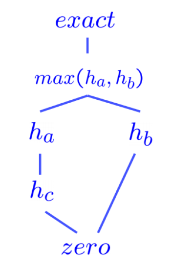 接下来,我们介绍一种比较两种启发式算法好坏的量度——支配性(dominance):若启发式算法 \(a\) 支配 (be dominant over) 启发式算法 \(b\),那么在状态空间图中,\(a\) 的评估目标距离将不小于 \(b\) 的评估目标距离,即:\(\forall n: h_a(n) \ge h_b(n)\),也就是说 \(a\) 能够更加接近地估计任意状态到达目标的实际距离。