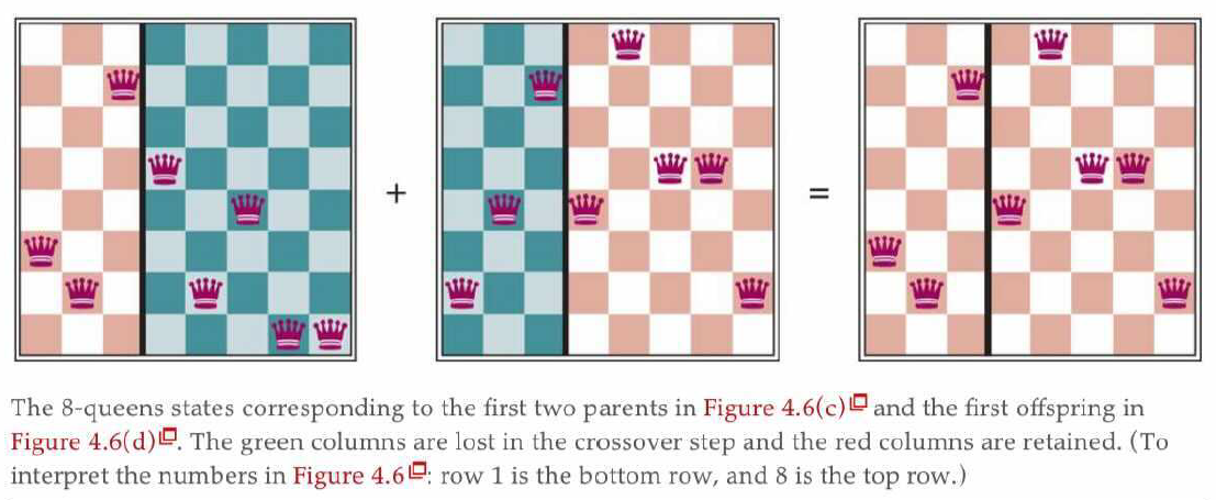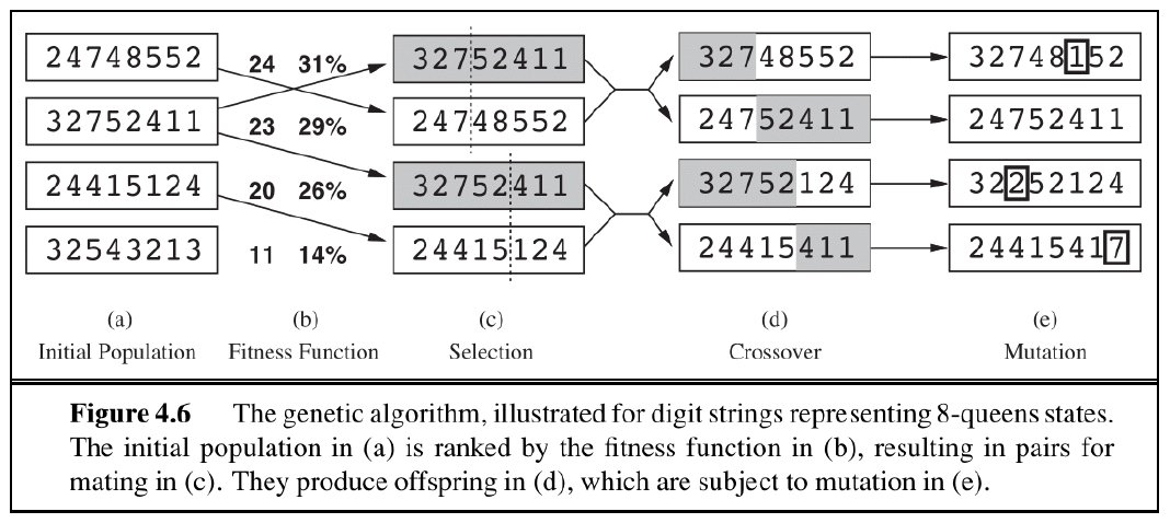 遗传算法(genetic algorithm) 的思路:它是局部束搜索的一个变体,它将挑选出来的 k 个状态视为人口(population),将状态视为个体(individuals),这些个体用来自有限字母表的字符串表示。