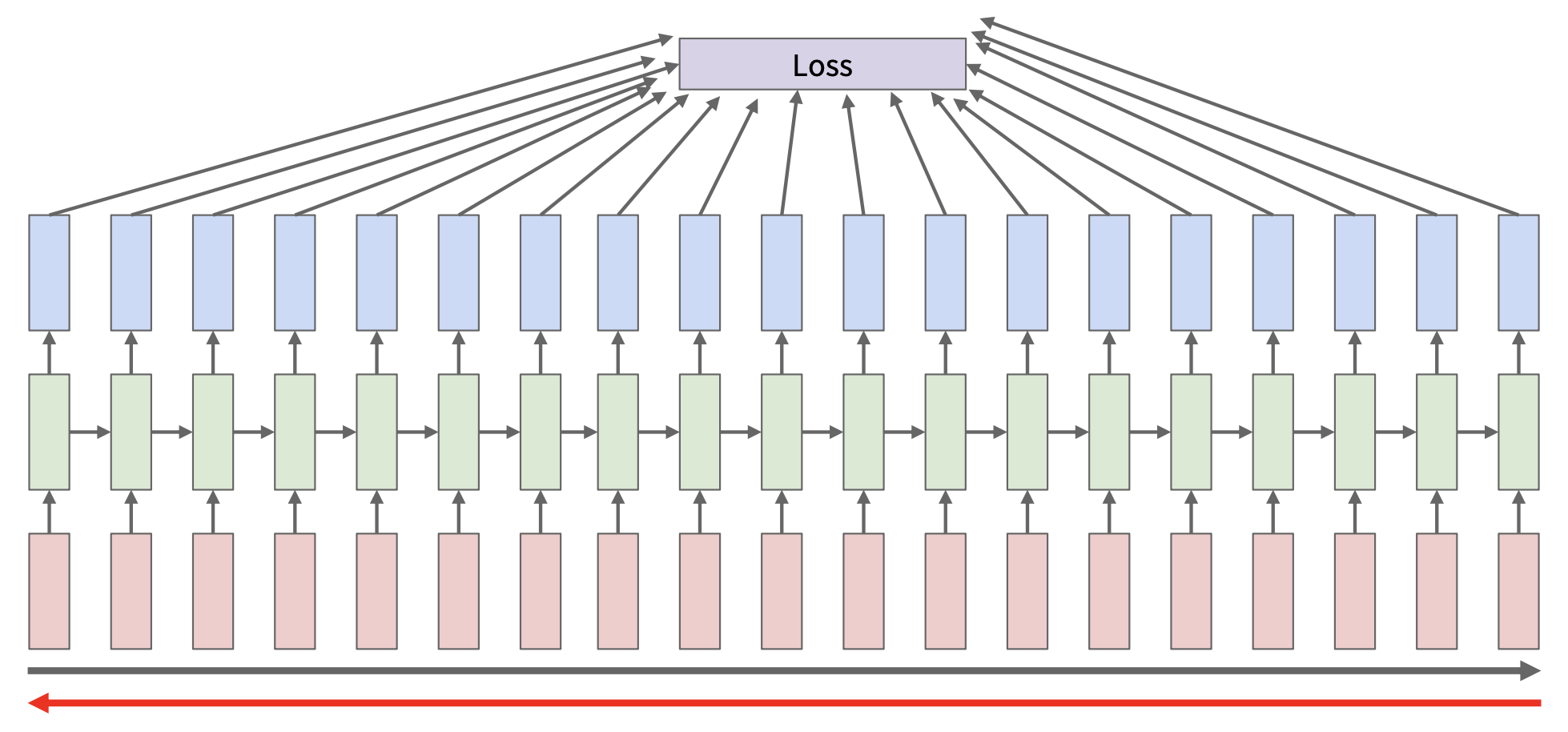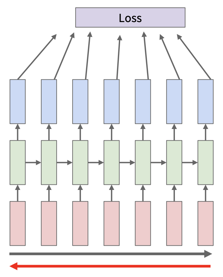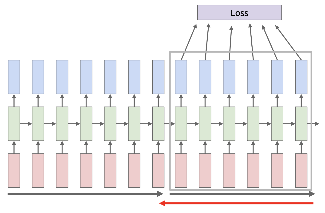在 RNN 中,向前遍历整个序列以计算损失,然后向后遍历整个序列以计算梯度(反向传播