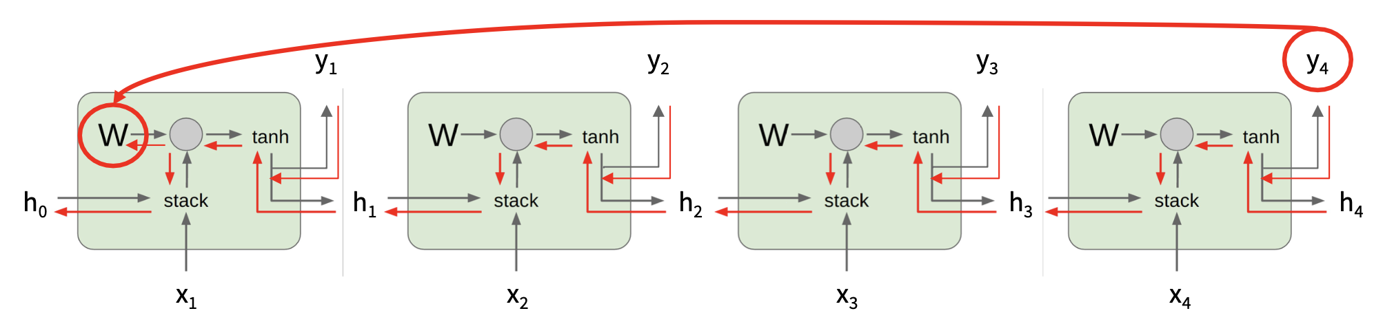 从 \(h_t\) 到 \(h_{t-1}\) 的反向传播乘以 \(W\)(实际上是 \(W_{hh}^T\)
