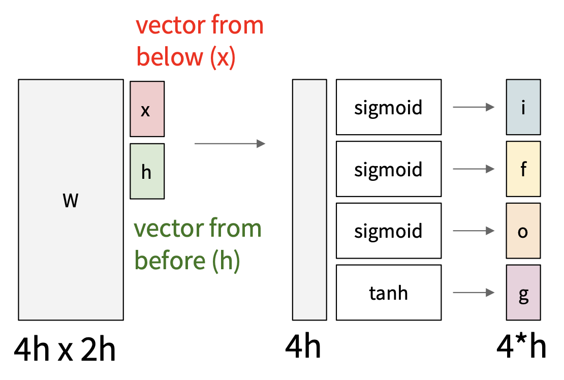 \[ \begin{aligned} \begin{pmatrix} i \\ f \\ o \\ g \end{pmatrix} & = \begin{pmatrix} \sigma \\ \sigma \\ \sigma \\ \tanh \end{pmatrix} W \begin{pmatrix} h_{t-1} \\ x_t \end{pmatrix} \\ c_t & = f \odot c_{t-1} + i \odot g \\ h_t & = o \odot \tanh(c_t) \end{aligned} \]