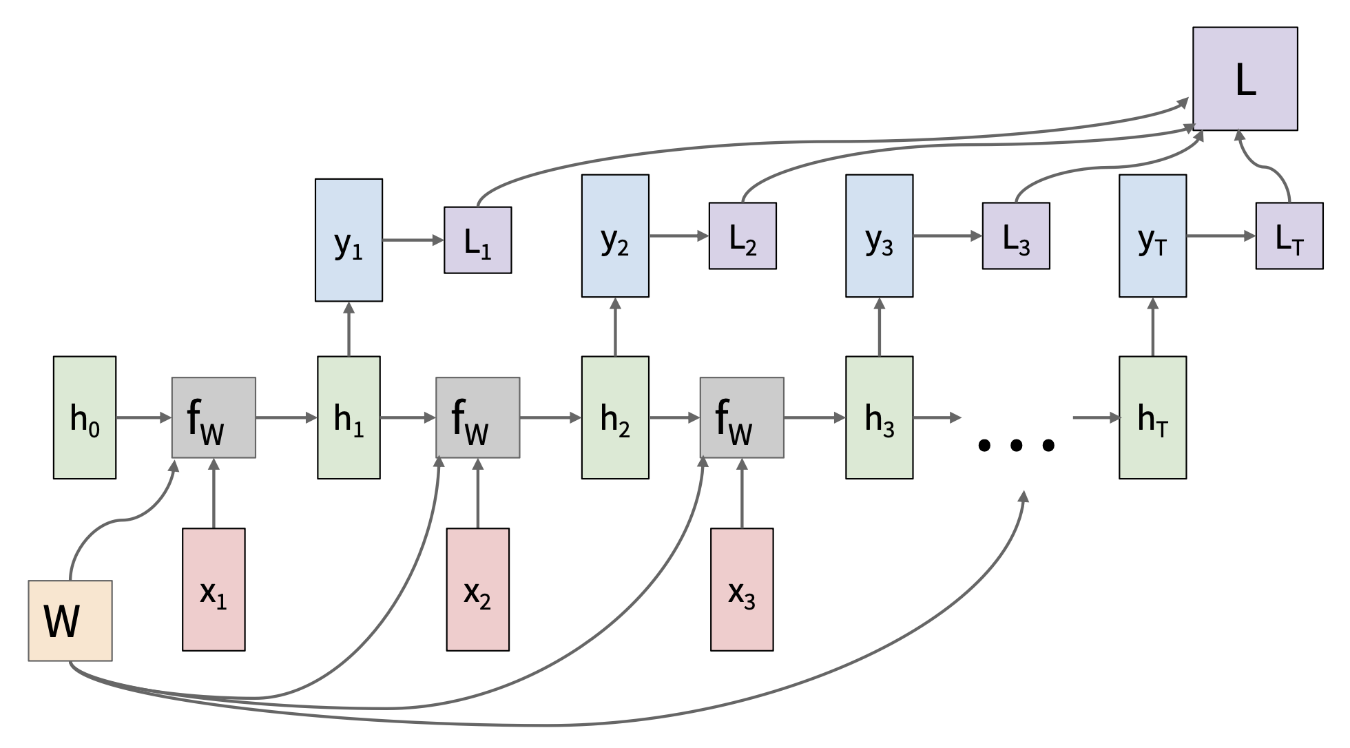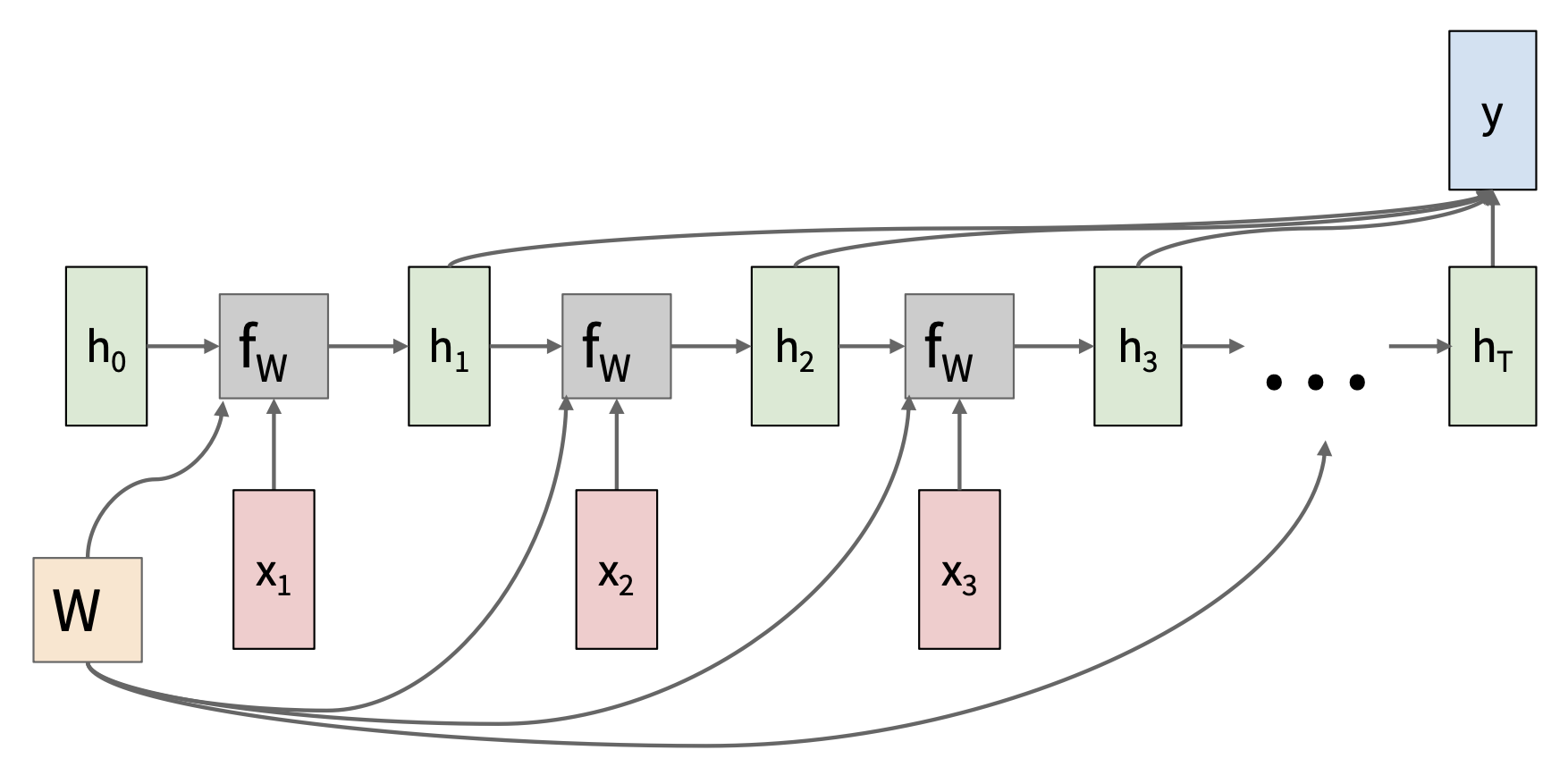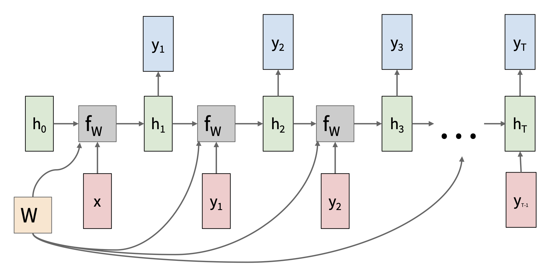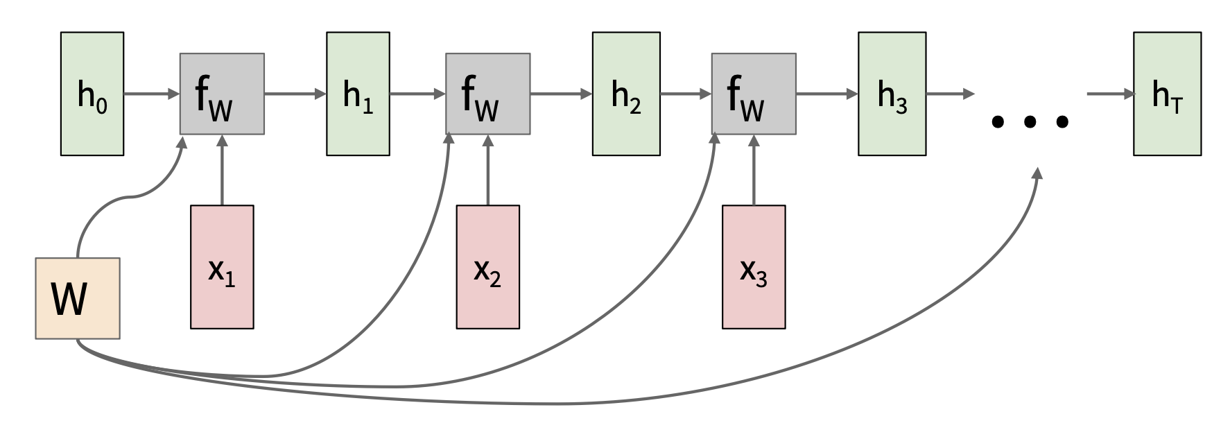- 隐含的状态更新:\(h_t = f_W(h_{t-1}, x_t)\)