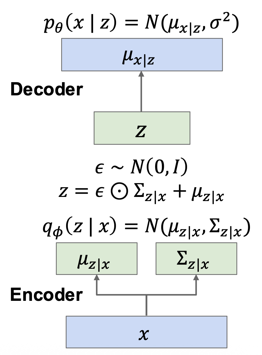 - \(q_\phi (z|x) = N(\mu_{z|x}, \Sigma_{z|x})\)