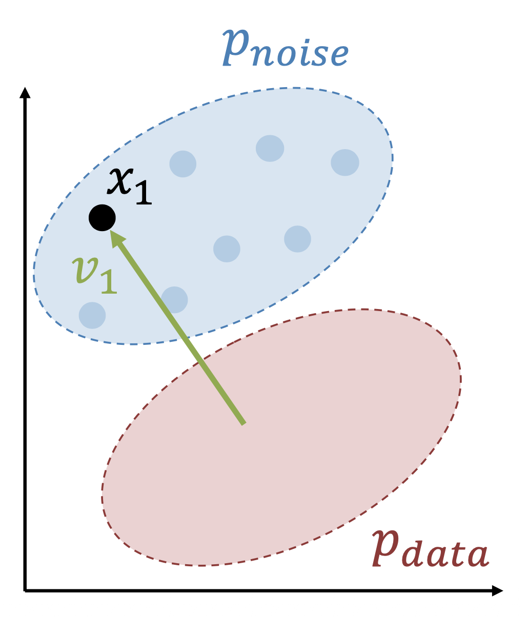 完全噪声(\(t=1\))很容易:最优的 \(v\) 是 \(p_\text{data}\) 的均值