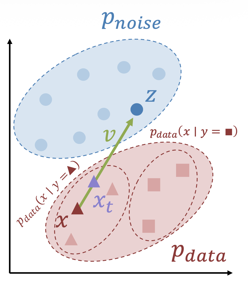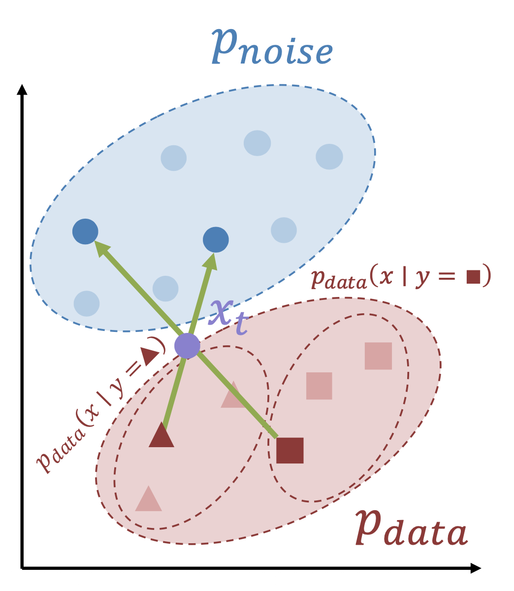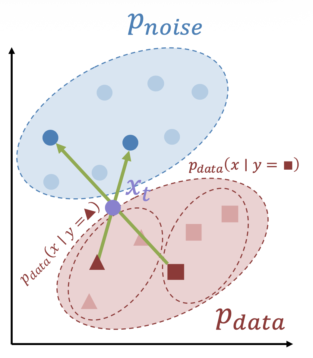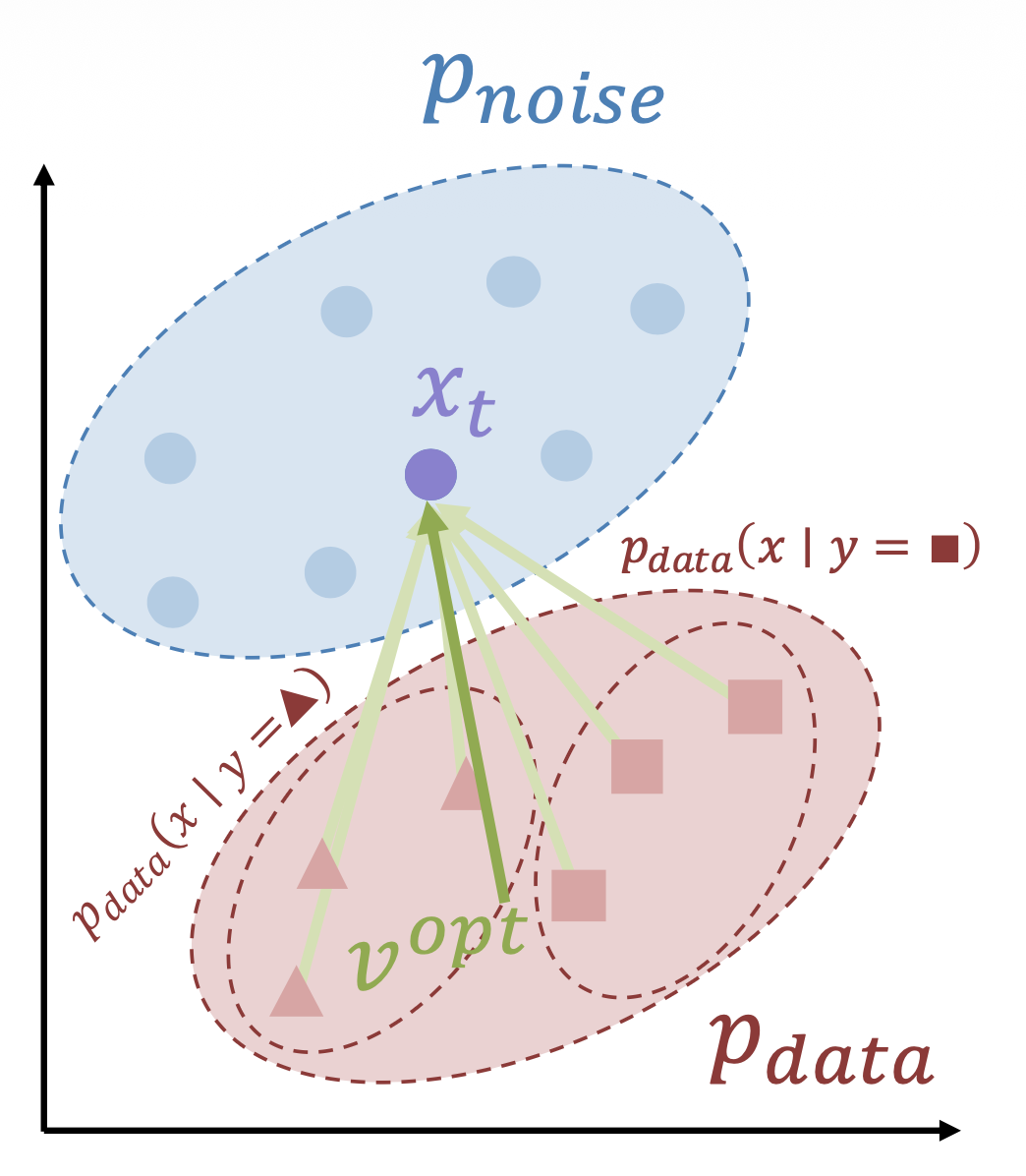 - \(\textcolor{yellowgreen}{v^y = f_\theta (x_t, y, t)}\) 指向 \(p(x | y)\)