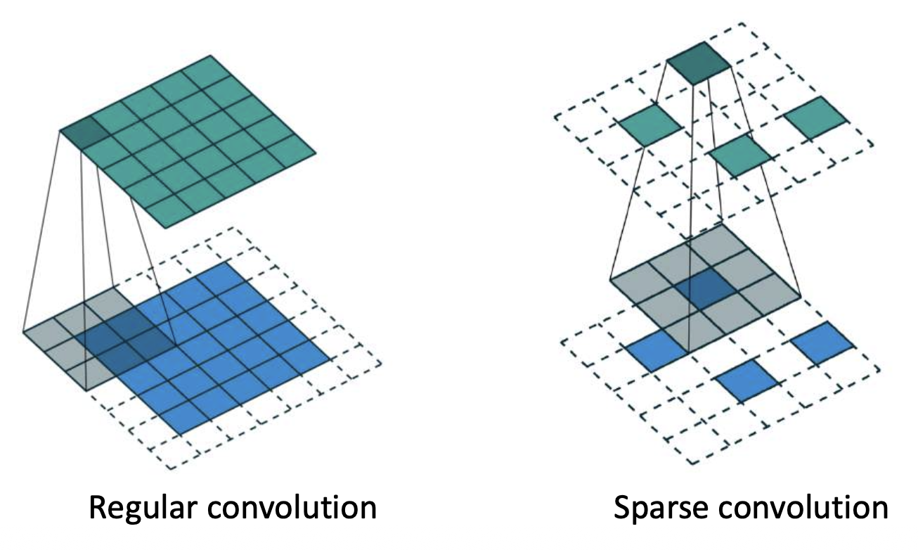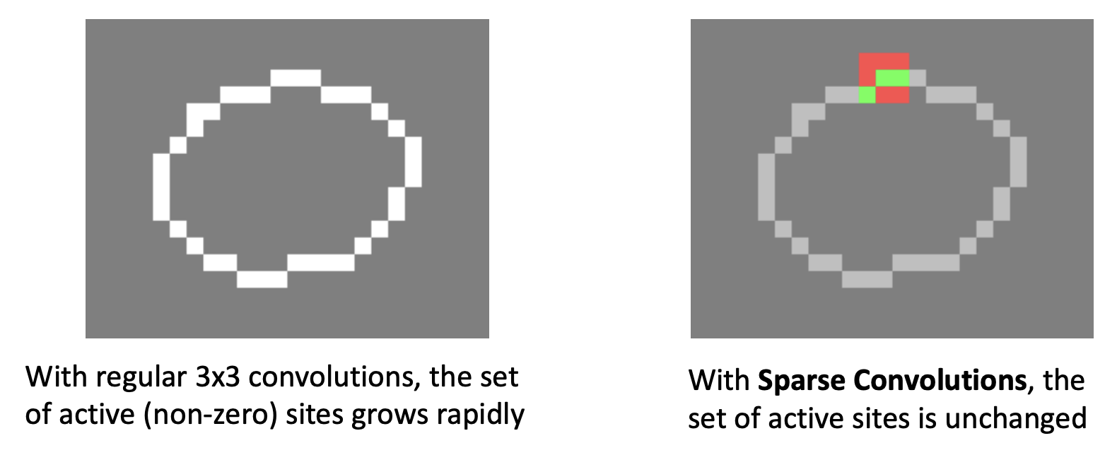 稀疏卷积(sparse convolution):仅在活跃位置(非零条目)计算内积 >网址:https://github.com/facebookresearch/SparseConvNet