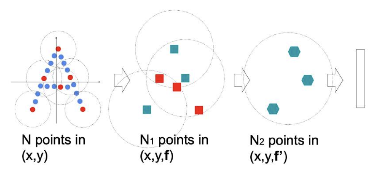 - 在每个邻域中应用 PointNet 以模拟卷积