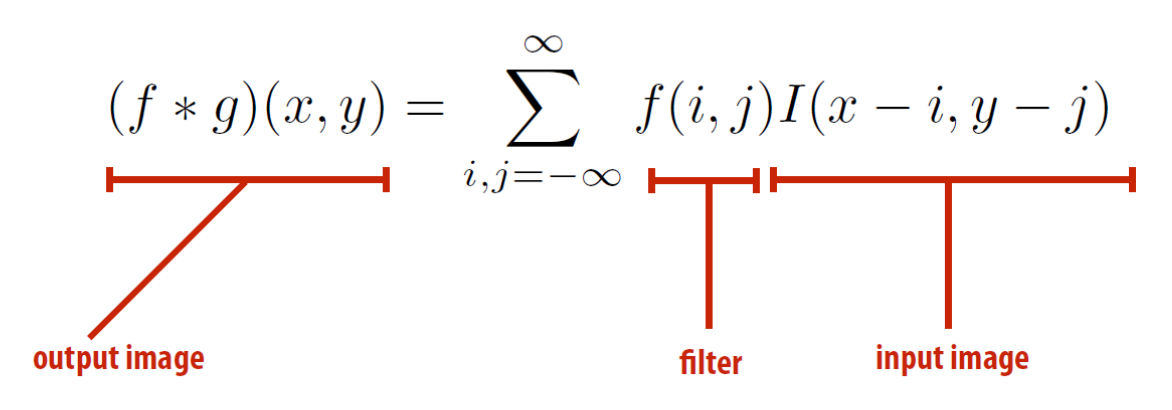 为方便操作,我们将滤波器(filter) \(f(i, j)\) 限制在 \(-1 \le i, j \le 1\) 的范围内,于是: $$ (f*I)(x,y)=\sum_{i,j=-1}^1f(i,j)I(x-i,y-j) $$