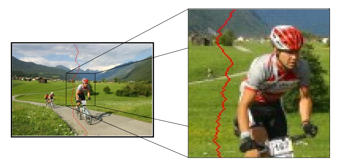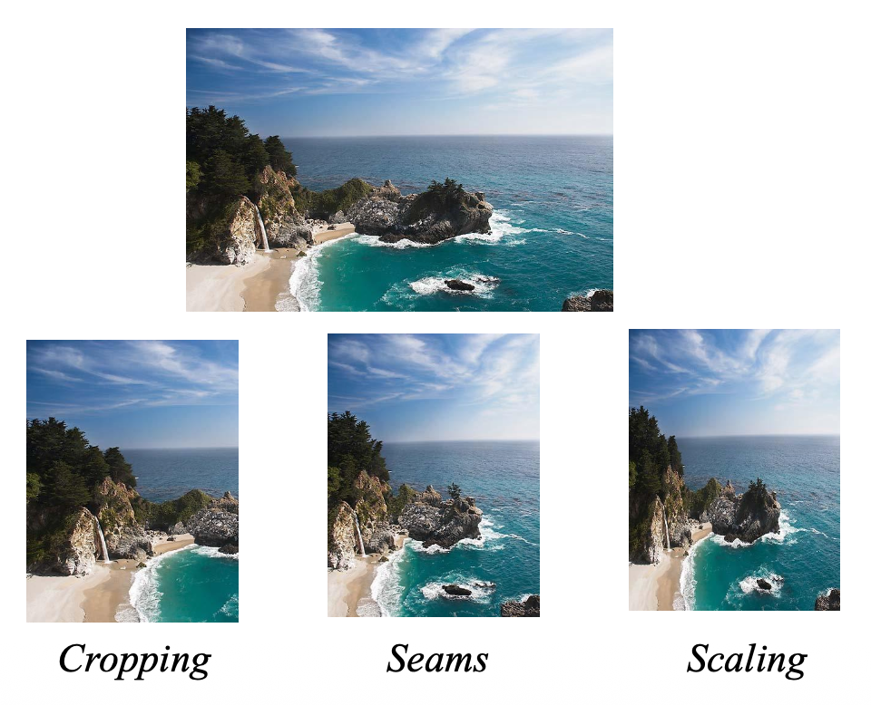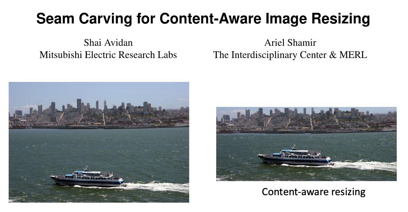 接缝裁剪(seam carving):自顶向下寻找像素的连接路径,其边缘能量为最小。
