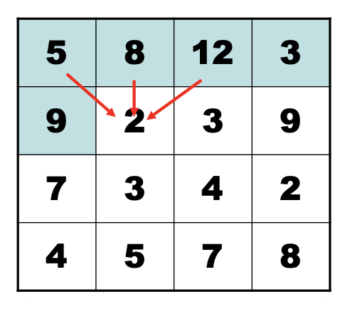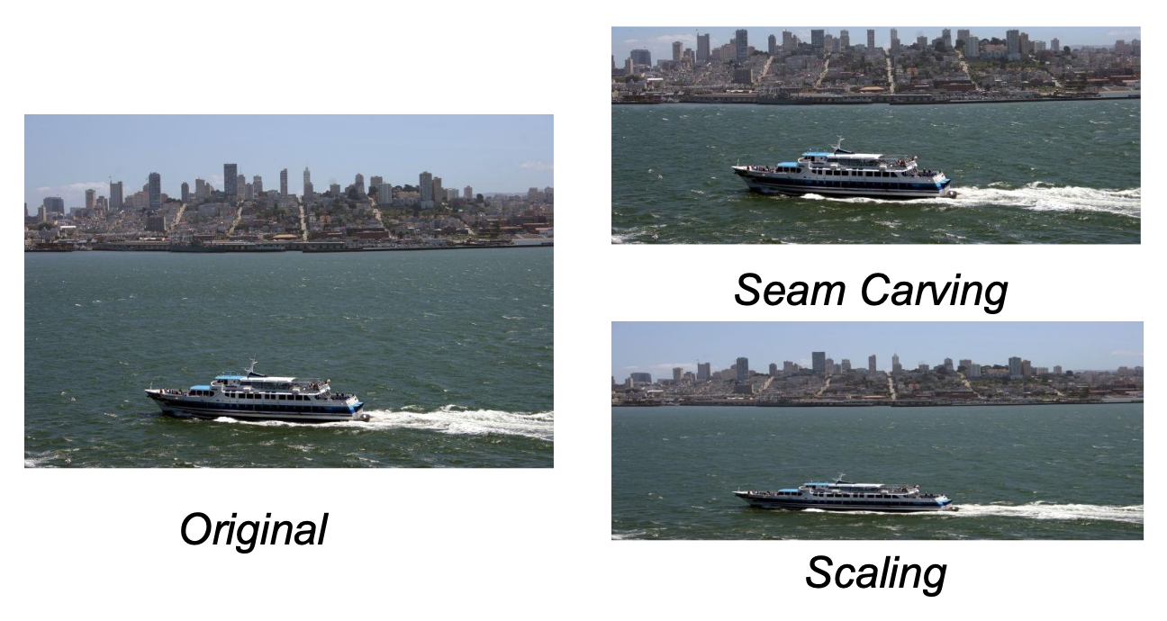 若 $\mathbf{M}(i, j) = $ 经过像素 \((i, j)\) 的缝 (seam) 的最小边缘能量,那么 $$ \mathbf{M}(i,j){=}E(i,j)+\min(\mathbf{M}(i-1,j-1),\mathbf{M}(i-1,j),\mathbf{M}(i-1,j+1)) $$