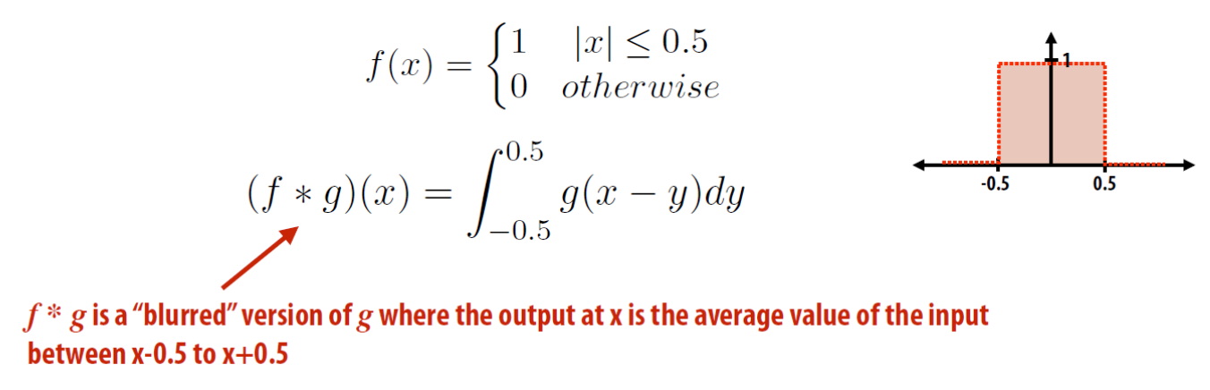 考虑最简单的情况——单位面积的盒状函数 \(f(x)\)——有助于我们理解卷积操作: