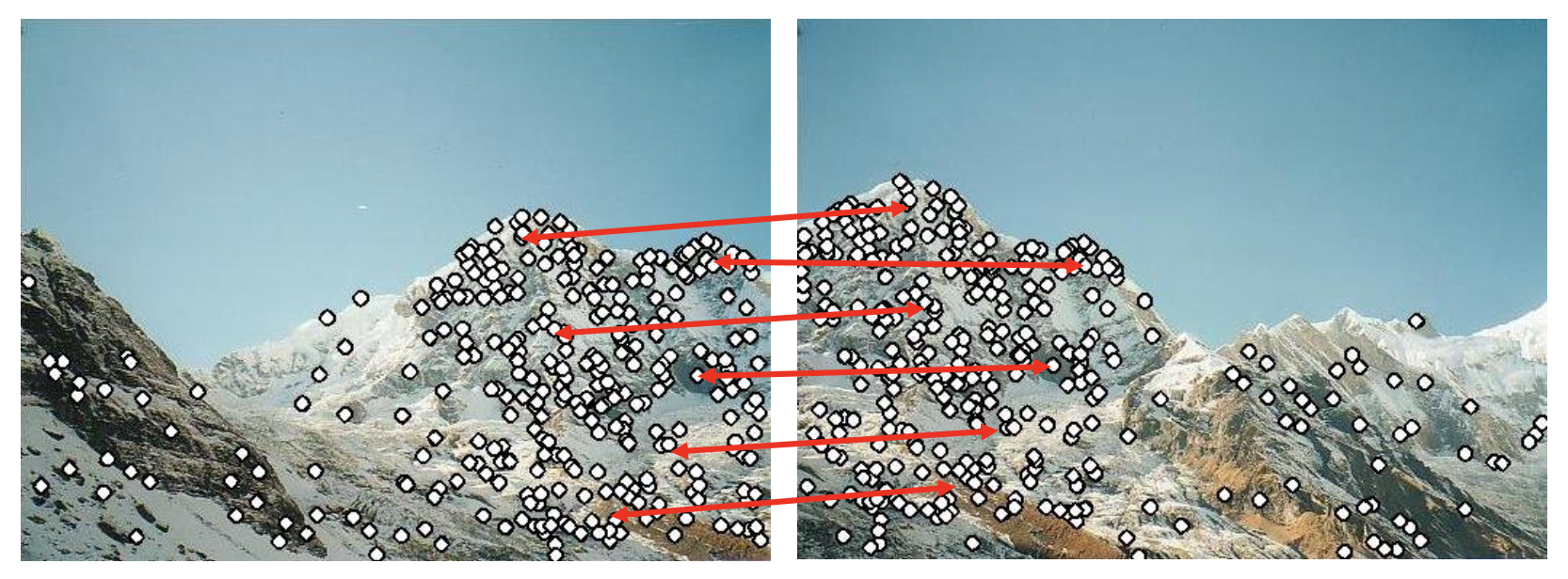 特征匹配(feature matching):寻找两图像之间点到点的对应关系。