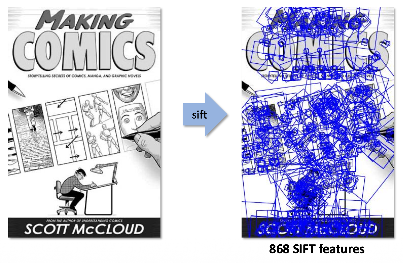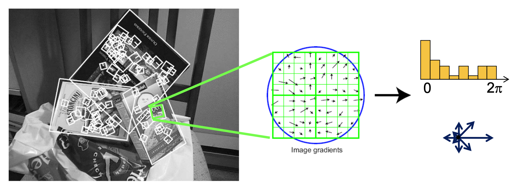 常用的一种方法是 SIFT(尺度不变特征变换 (scale invariant featrue transform))描述符,它有一个关于方向梯度的直方图。