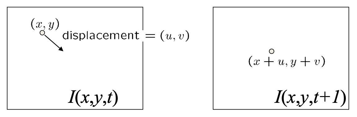 \[ \begin{aligned} I(x + u, y + v, t + 1) \approx I(x, y, t) + I_x \cdot u + I_y \cdot v + I_t \\ I(x + u, y + v, t + 1) - I(x, y, t) = I_x \cdot u + I_y \cdot v + I_t \\ I_x \cdot u + I_y \cdot v + I_t \approx 0 \quad \rightarrow \quad \nabla I \cdot \begin{bmatrix}u & v\end{bmatrix}^T + I_t = 0 \end{aligned} \]