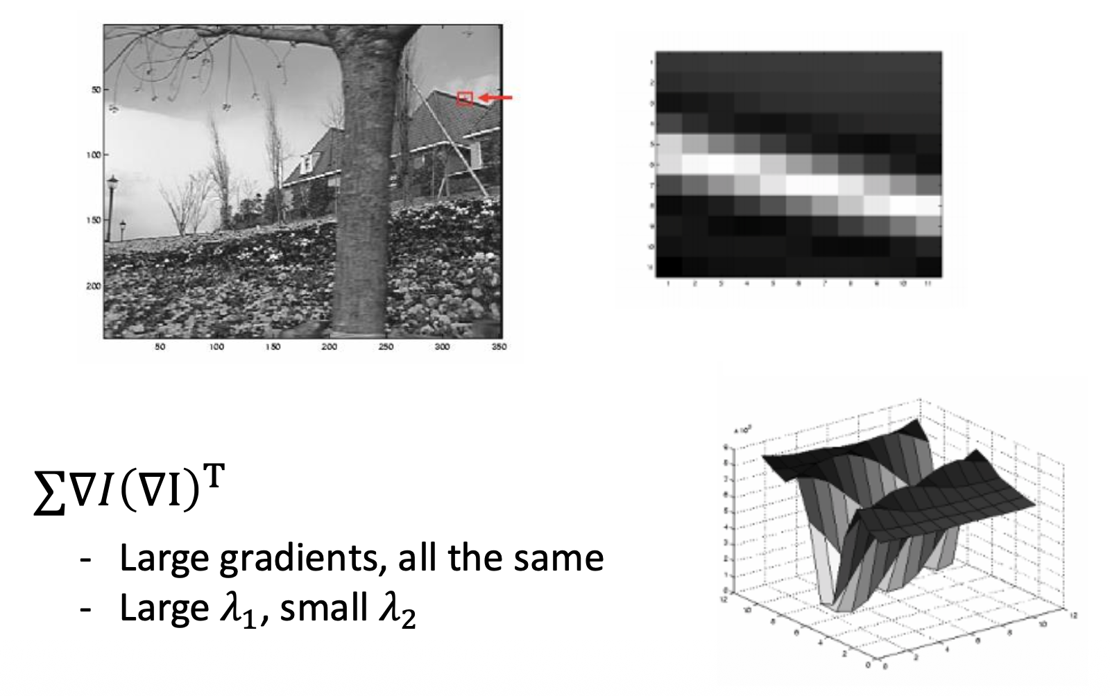 \[ H=\sum_{(u,v)}w(u,v)\begin{bmatrix}I_x^2&I_xI_y\\I_xI_y&I_y^2\end{bmatrix}\quad I_x=\frac{\partial f}{\partial x},I_y=\frac{\partial f}{\partial y} \]