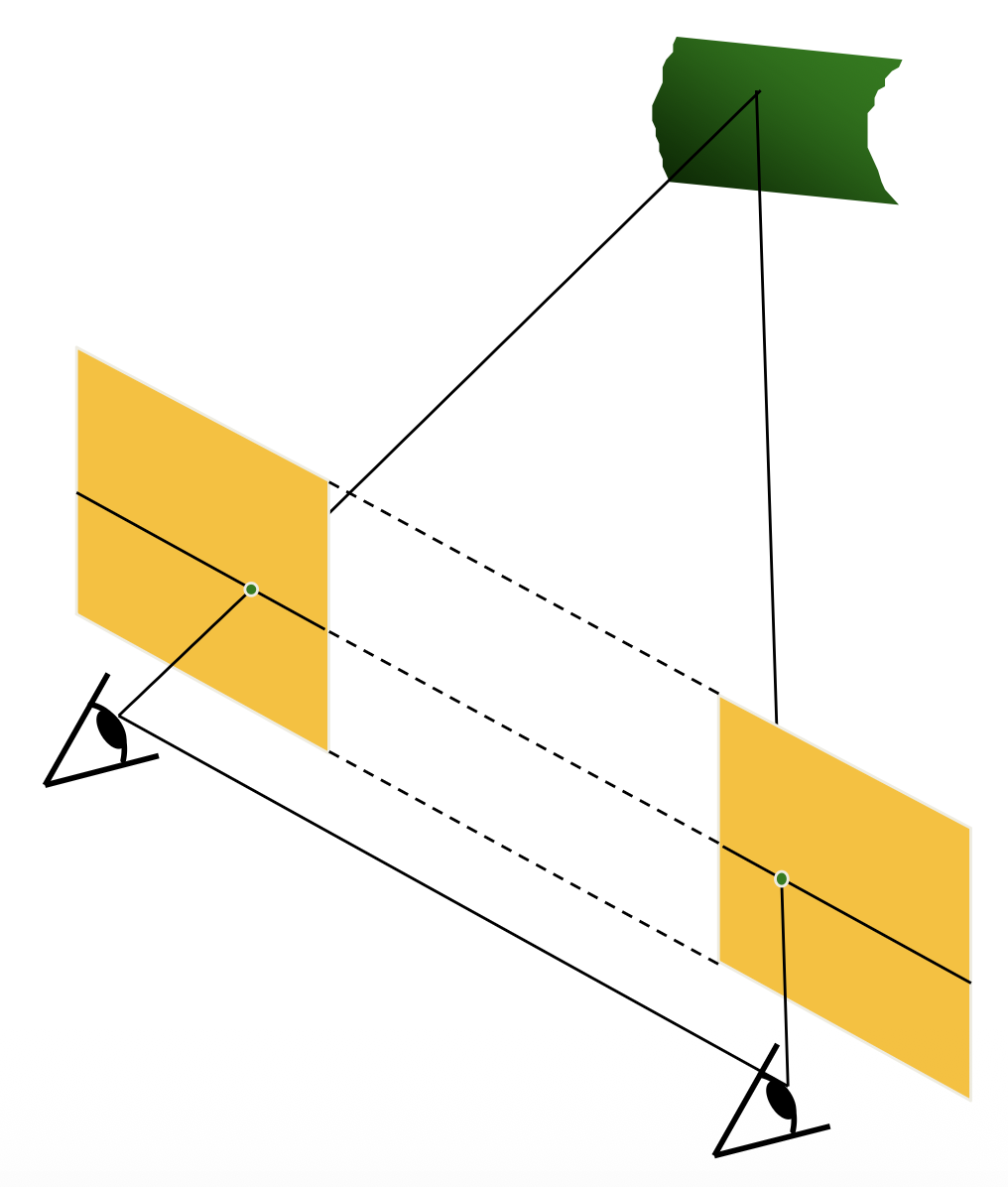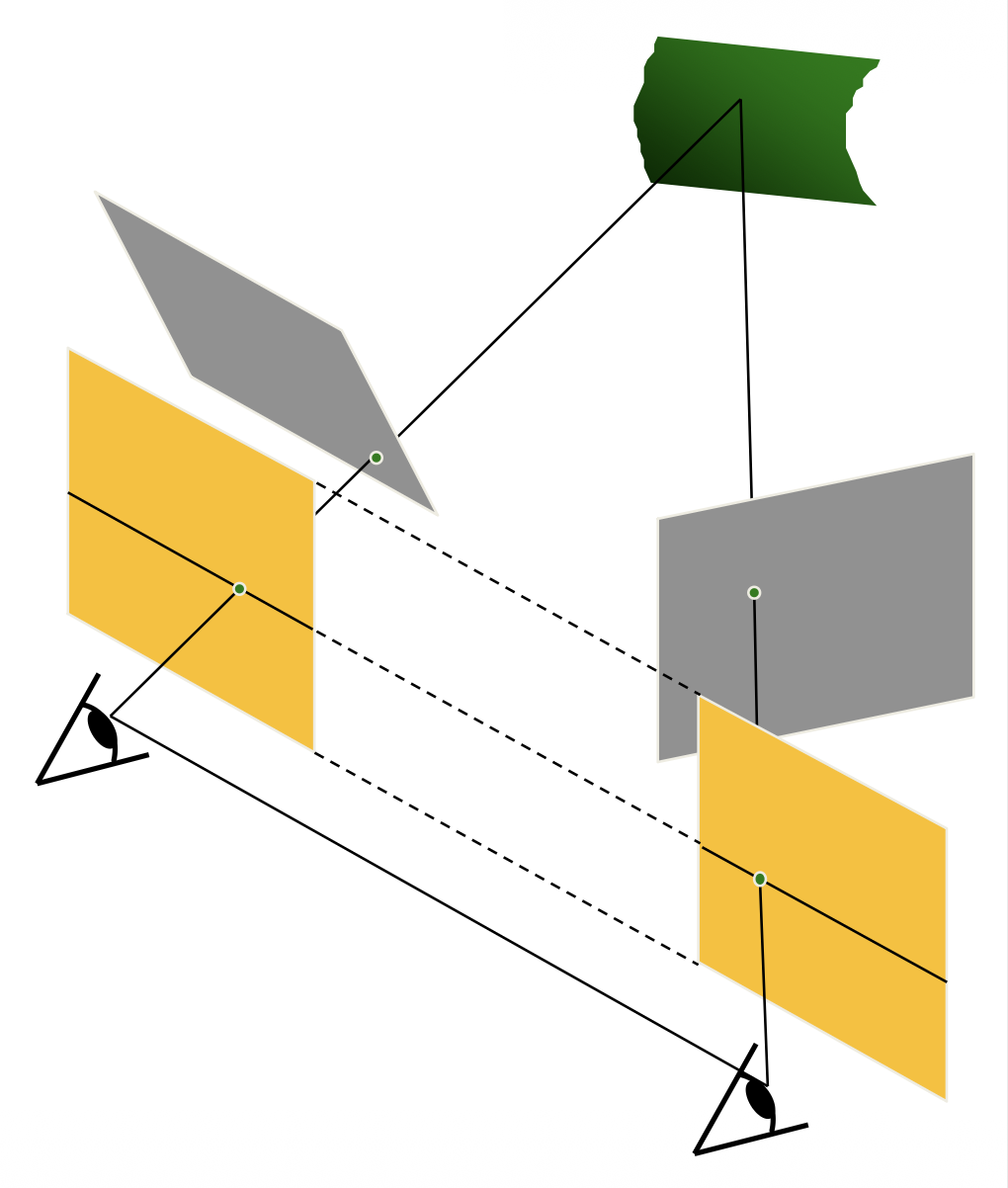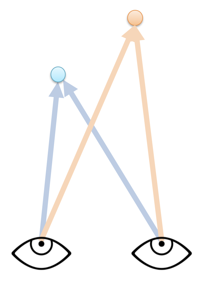 - 两条射线在单个点上相交,因此若要在三维空间中定位点,就需要两只眼睛