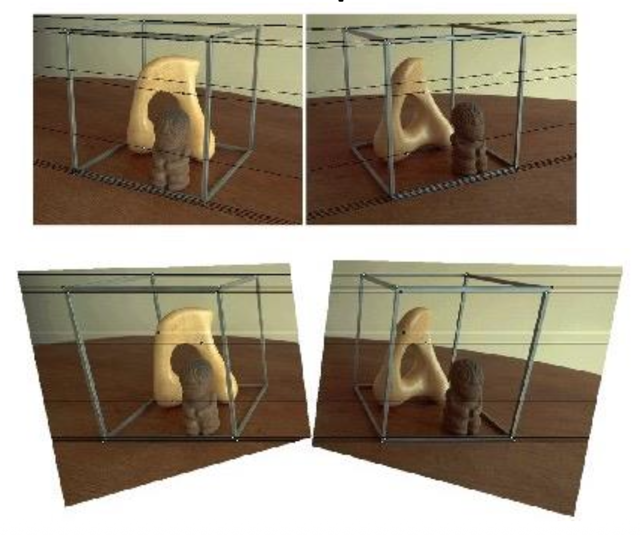 假如极线不是扫描线,那么需要将图像平面重新投影到一个与相机中心之间的线平行的公共平面上;这一操作需要两个单应性(3x3)变换,每个变换对应一个输入图像重投影操作。