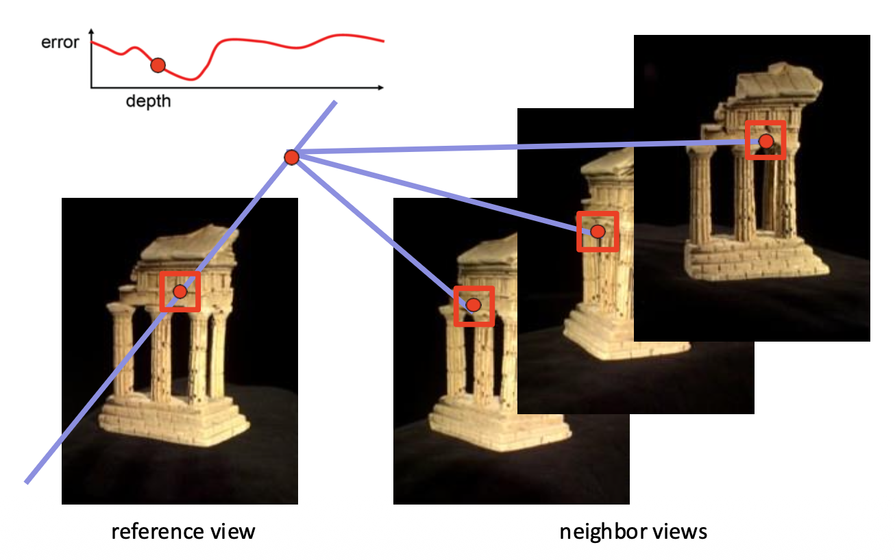 计算参考图像中每个点的每个深度值的误差,寻找给出最小误差的深度值