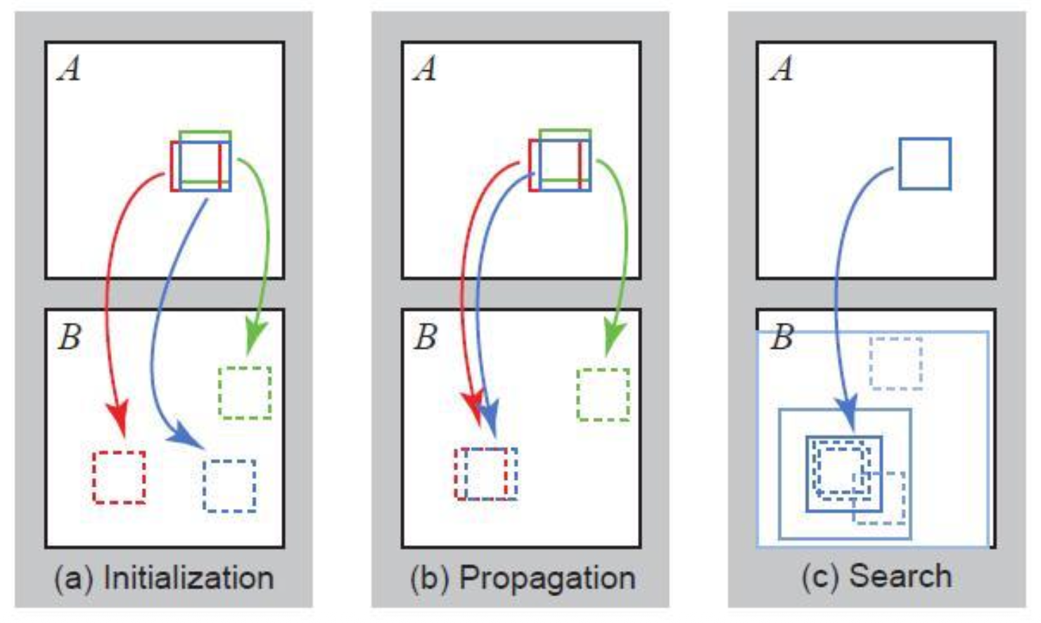 - 传播(propagation):每个像素检查邻近块的偏移量是否提供了更好的匹配块;如果是,则采用邻居的块偏移量