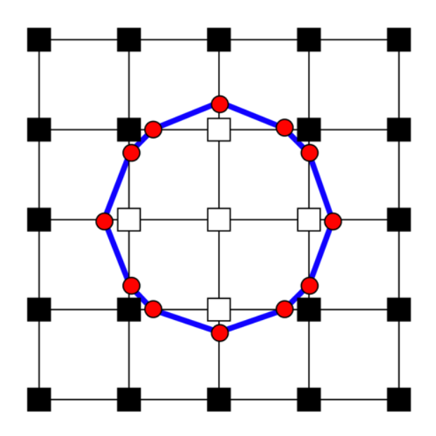 在了解行进立方体之前,为便于理解,先来看二维的行进正方形(marching squares)。对于每个有符号变化的网格单元: