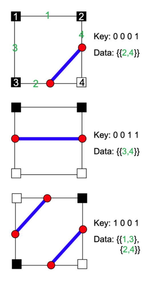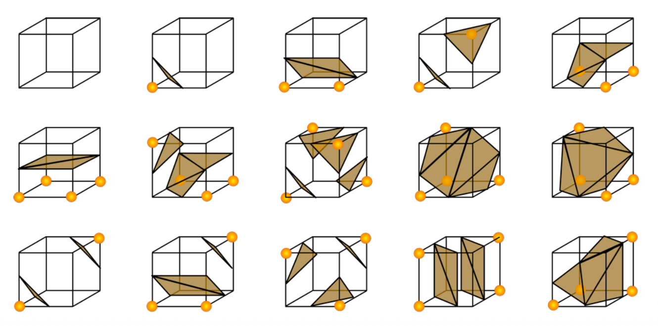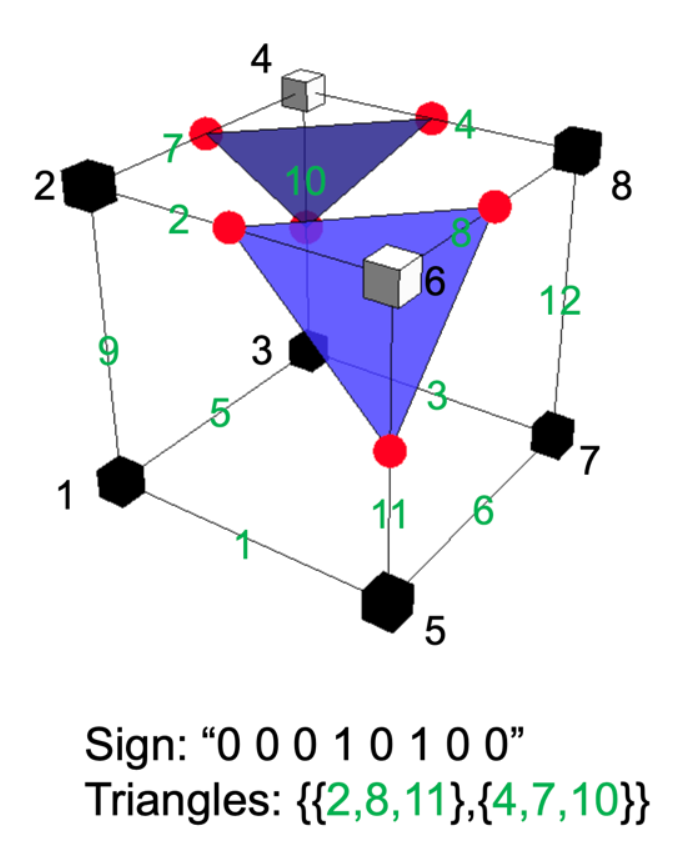 - 对于每个符号配置,它存储了构成三角形的顶点所对应的网格边的索引
