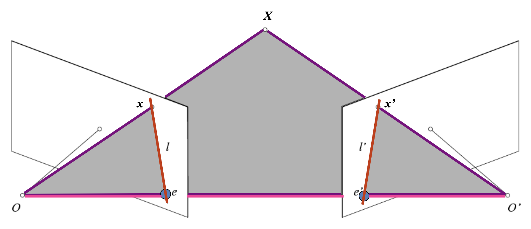- 极线 (epipolar line):极面和像平面的交线(\(l, l'\))