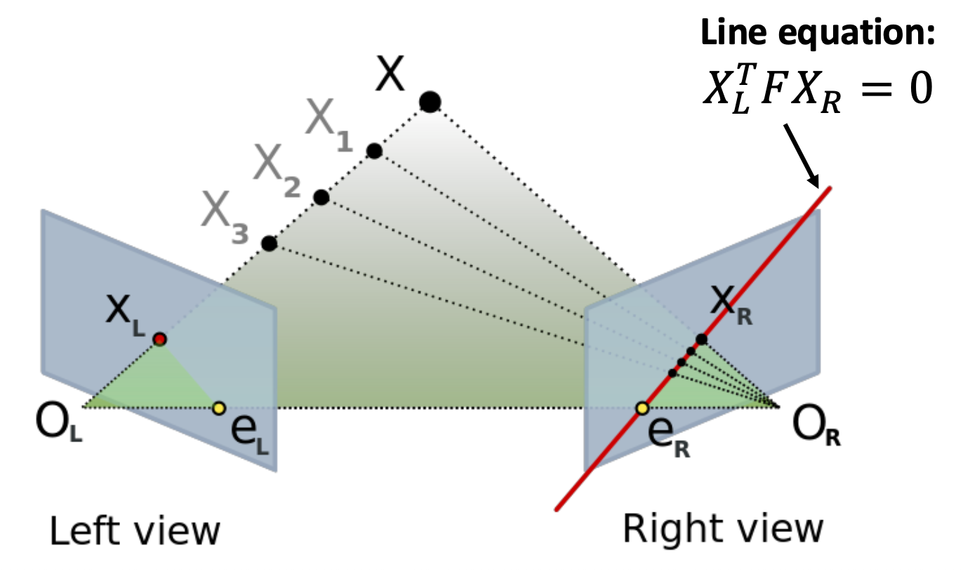 给定 \(X_L\),它在另一个图像 \(X_R\) 上的匹配必定落在极线(下图的红线)上。