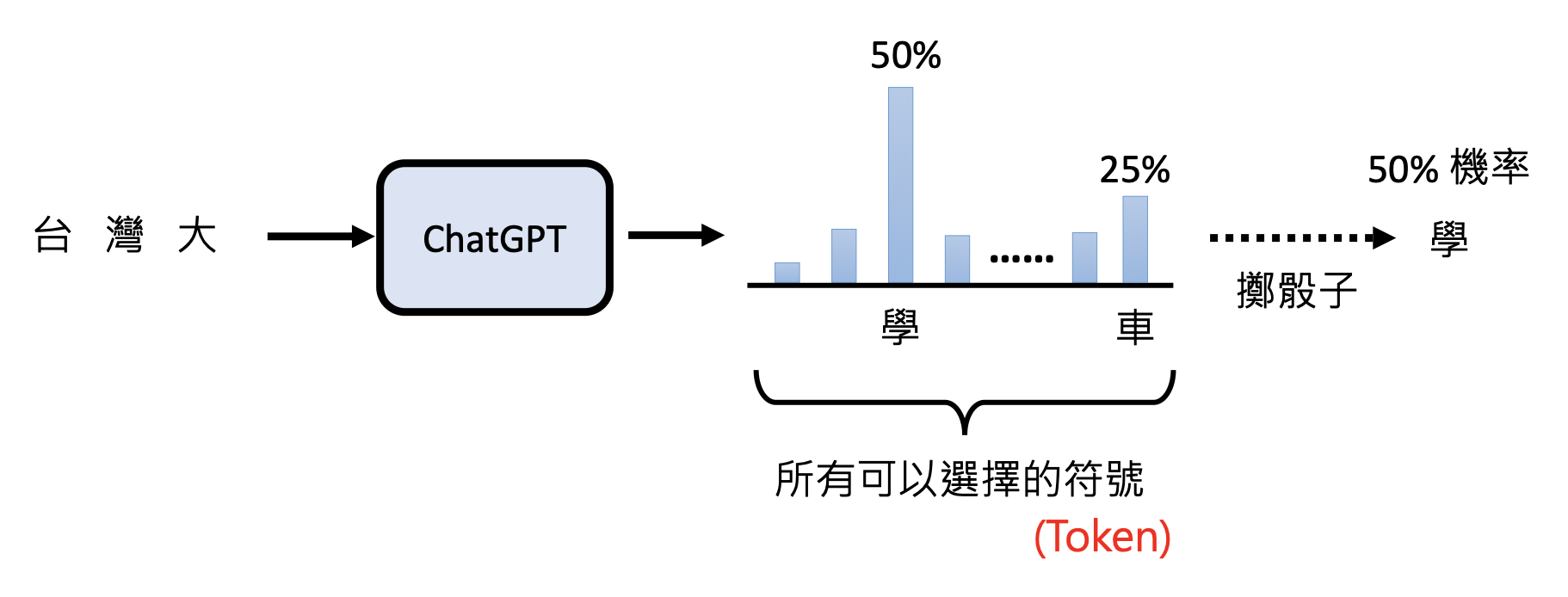 GPT 本质上也是一个语言模型,所以它也会以文字接龙的形式呈现答案。实际上 GPT 不会马上一个 token 一个 token 地输出,它首先会给出一个关于 token 概率分布,然后从中随机采样一个 token 作为输出,所以 ChatGPT 每次给出的答案不一定相同。