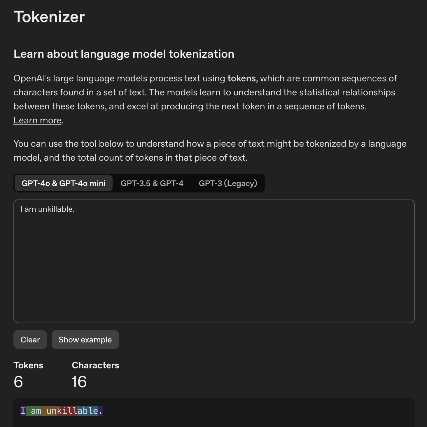 GPT 以 token 作为处理文本的最小单位。注意 token 不等同于英文中的单词或中文的汉字,而且不同语言的 token 往往是不同的。要想知道 GPT 是如何区分文本中的 token 的话,可以用用 OpenAI 的分词器(tokenizer)。
