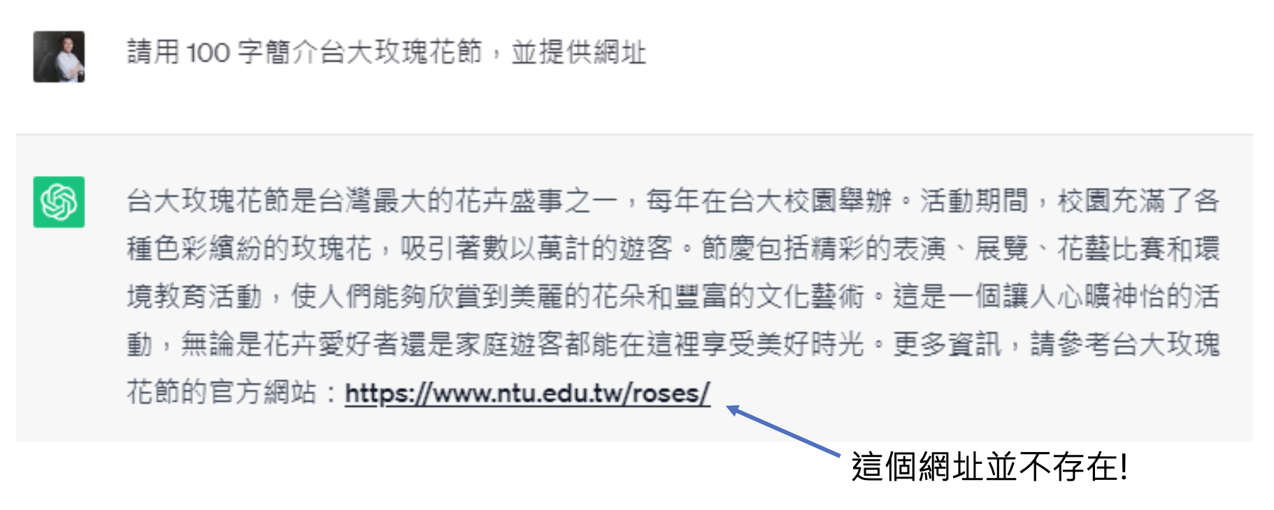 但正因为这一特性,ChatGPT 有时会胡言乱语,编造出不存在的东西,比如不存在的台大玫瑰花节: