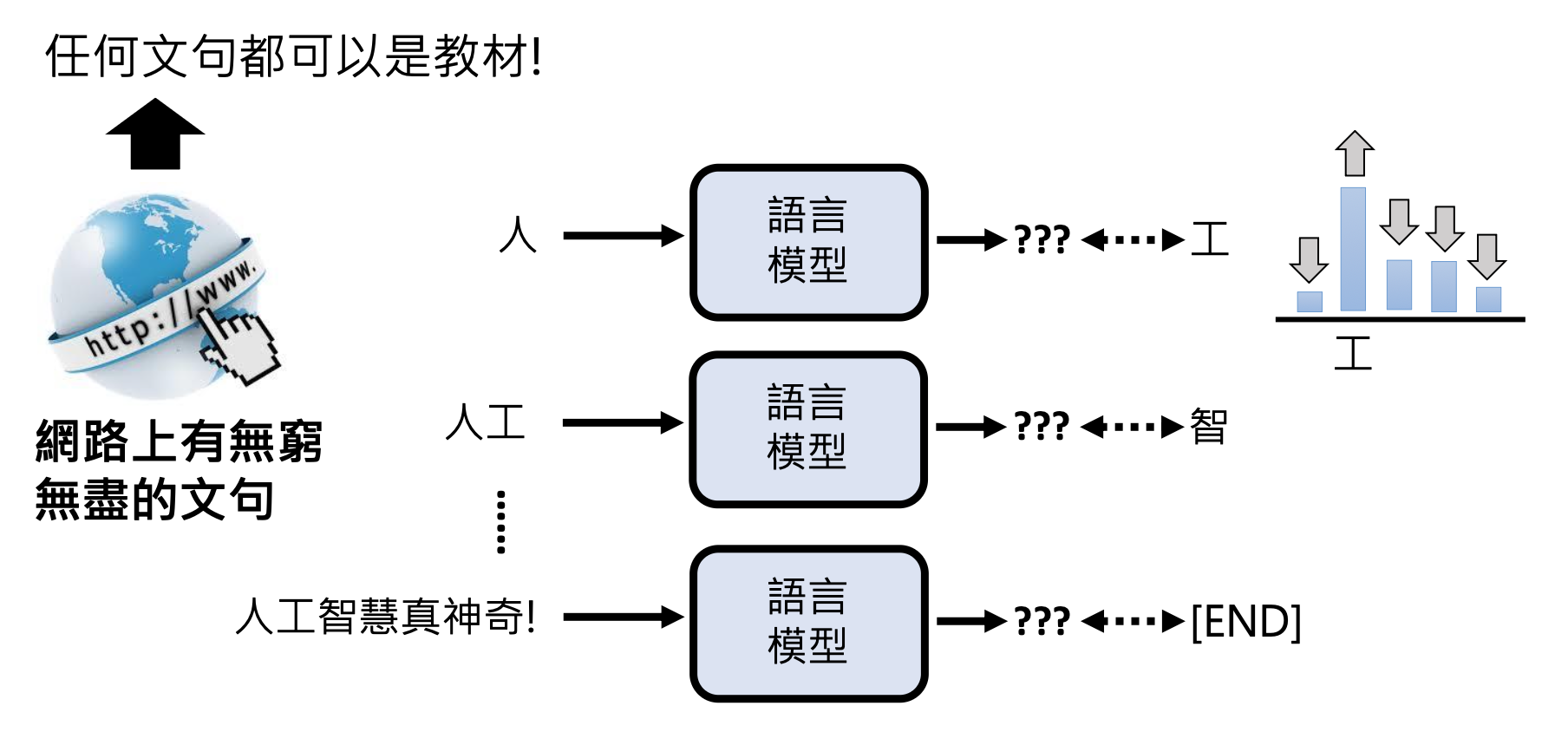 那么像 GPT 这样的语言模型是如何学会文字接龙的呢?对模型而言,任何文本资料都可以作为它学习的教材。得益于互联网的广泛普及,现在互联网上已经有巨量的文本资料,这也正是 GPT 训练数据的主要来源之一。