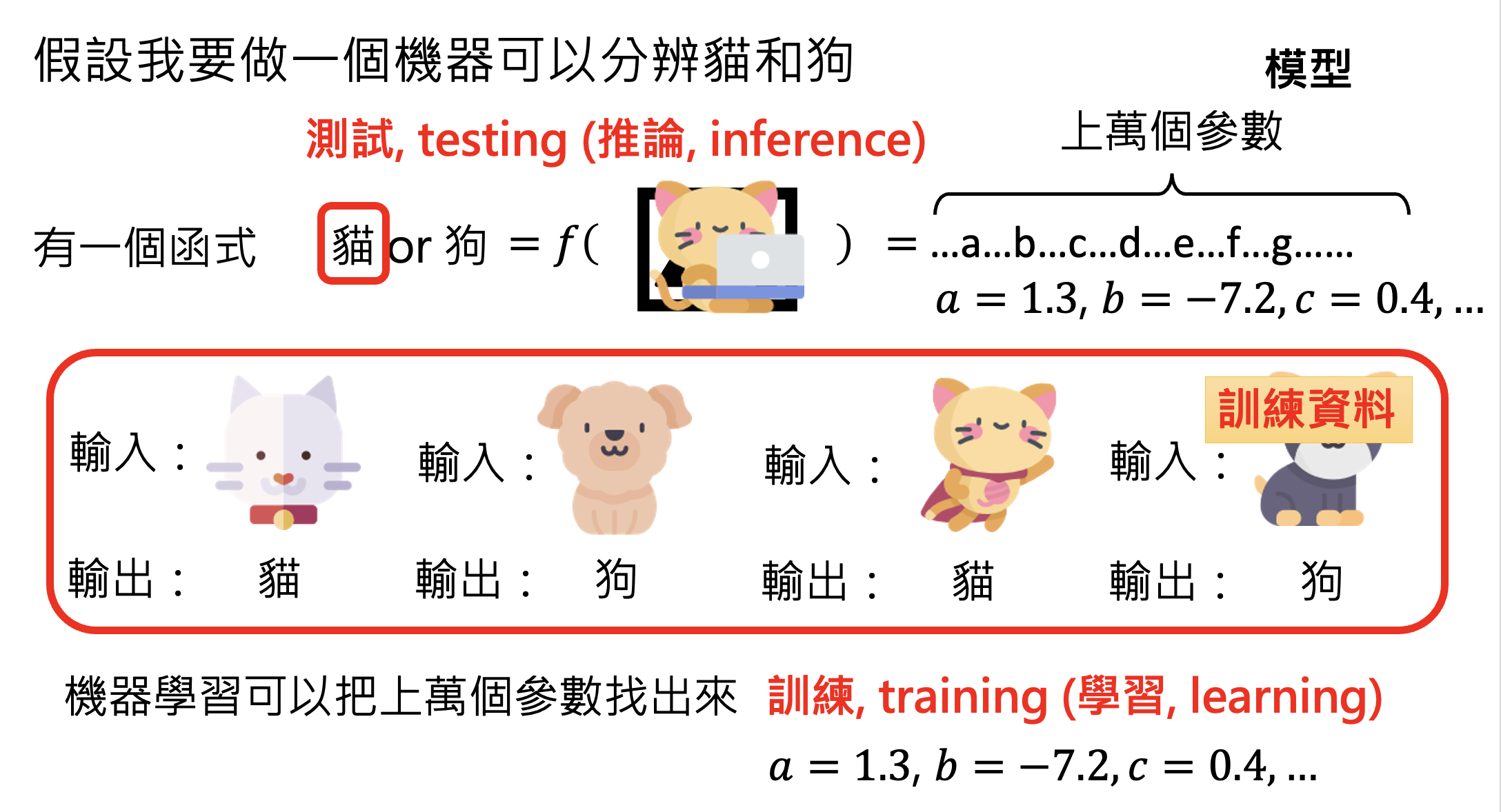 说到 AI,一个避不开的话题便是机器学习(machine learning),我们可简单理解为:让机器自动地从数据中找出一个函数。下图展示了机器学习的大致流程: