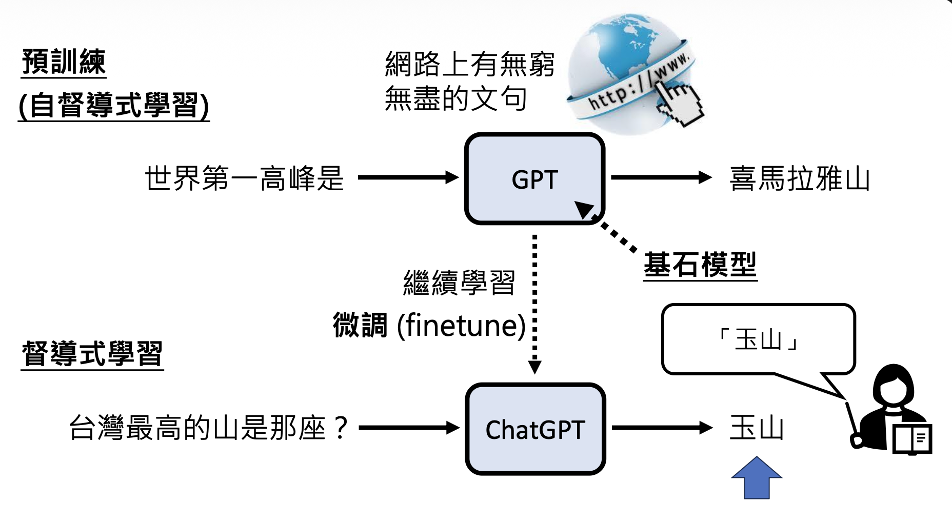 像 GPT 从互联网文本中学习的方式叫做预训练(pre-train),又称自监督学习(self-supervised learning)。要想让模型输出正确的答案,需要人类明确指出什么是正确的答案,这样模型就知道该如何学习下去了。我们称这样的学习方式为监督学习(supervised learning)。自监督学习的模型继续通过监督学习训练的过程叫做微调(fine-tune)。