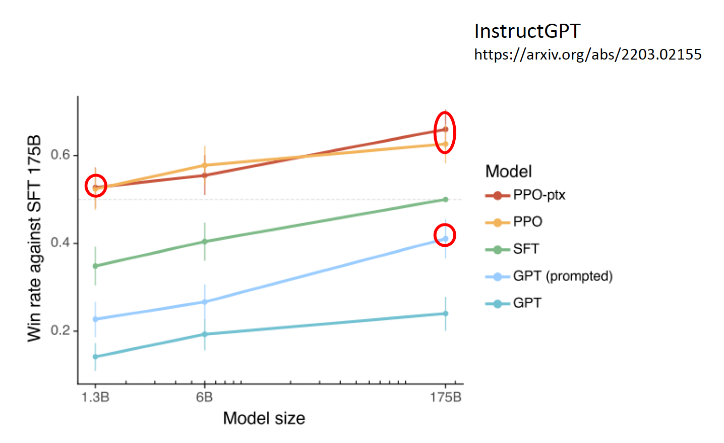 加上监督学习后,GPT-3 的表现得到了不小的进步(图中的黄色和红色曲线,蓝色为最原始的 GPT-3