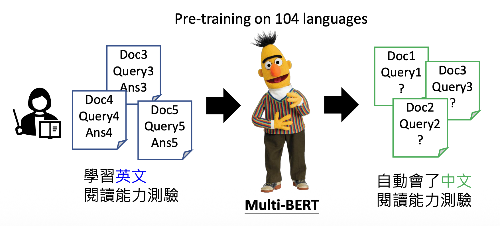 从另一个角度看,有了预训练后,监督学习就无需大量的数据了。比如在多种语言上做预训练后,只要之后教模型某一个语言上的某一个任务,模型就会知道如何解决其他语言的同种任务。