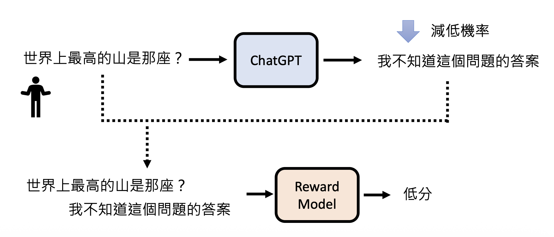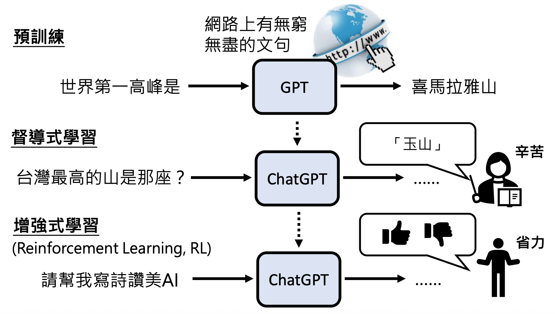在预训练后,GPT 还会再经过一轮强化学习(reinforcement learning, RL)。强化学习有时又称为来自人类反馈的强化学习(reinforcement learning from human feedback, RLHF),它不是直接给出正确答案,而是根据模型的答案给出评价,让模型知道什么样的答案是好的,什么答案又是不好的。对于人类而言,强化学习相比监督学习更轻松,因为不需要再花力气准备正确答案。