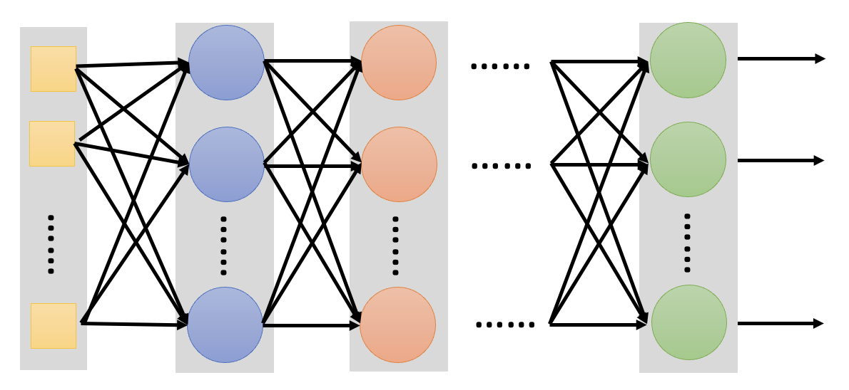 那么具体该如何寻找函数呢?一种常见技术叫做深度学习(deep learning),它通过一个叫做神经网络(neural network) 的东西来寻找合适的参数。网络的一般架构如下所示: