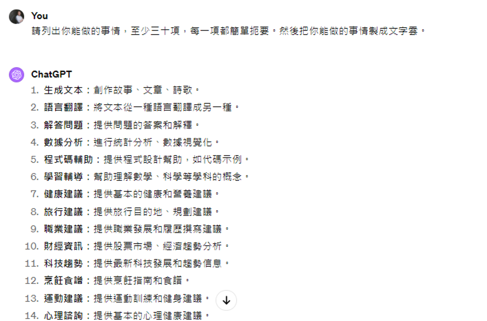 可以看到,ChatGPT 确实能总结出 30 个能做的事情,但是给出的词云却是一篇乱码。将这个问题反馈给 ChatGPT,它的回答是: