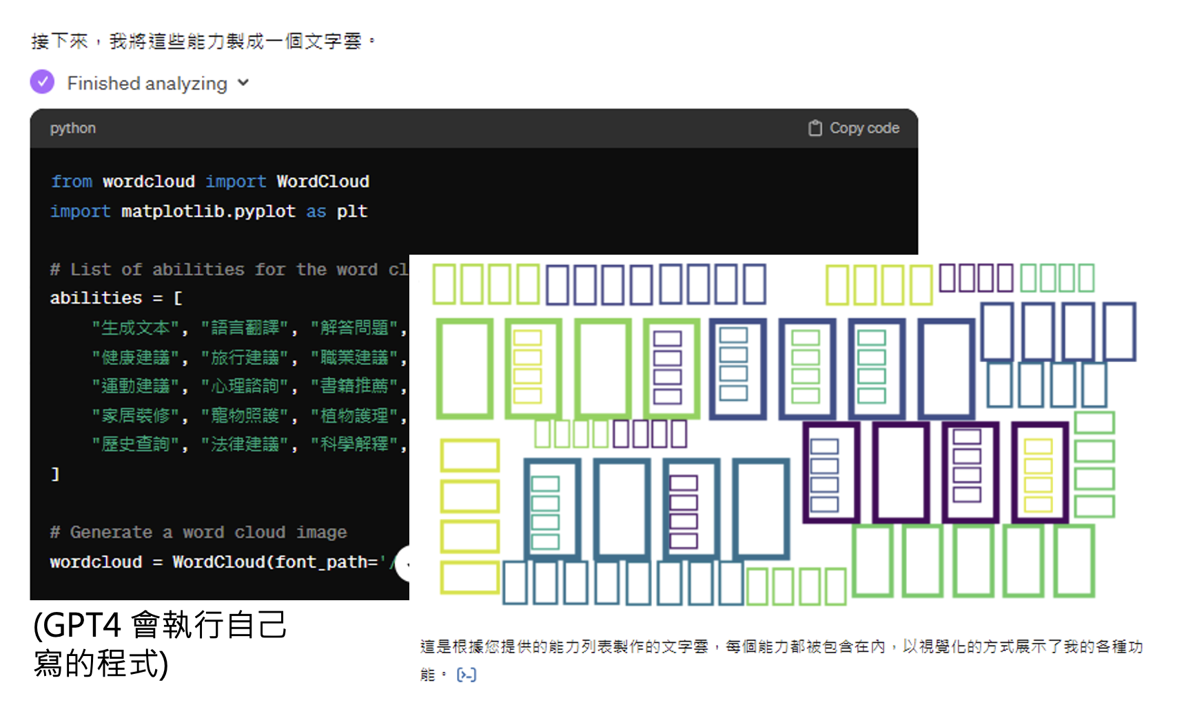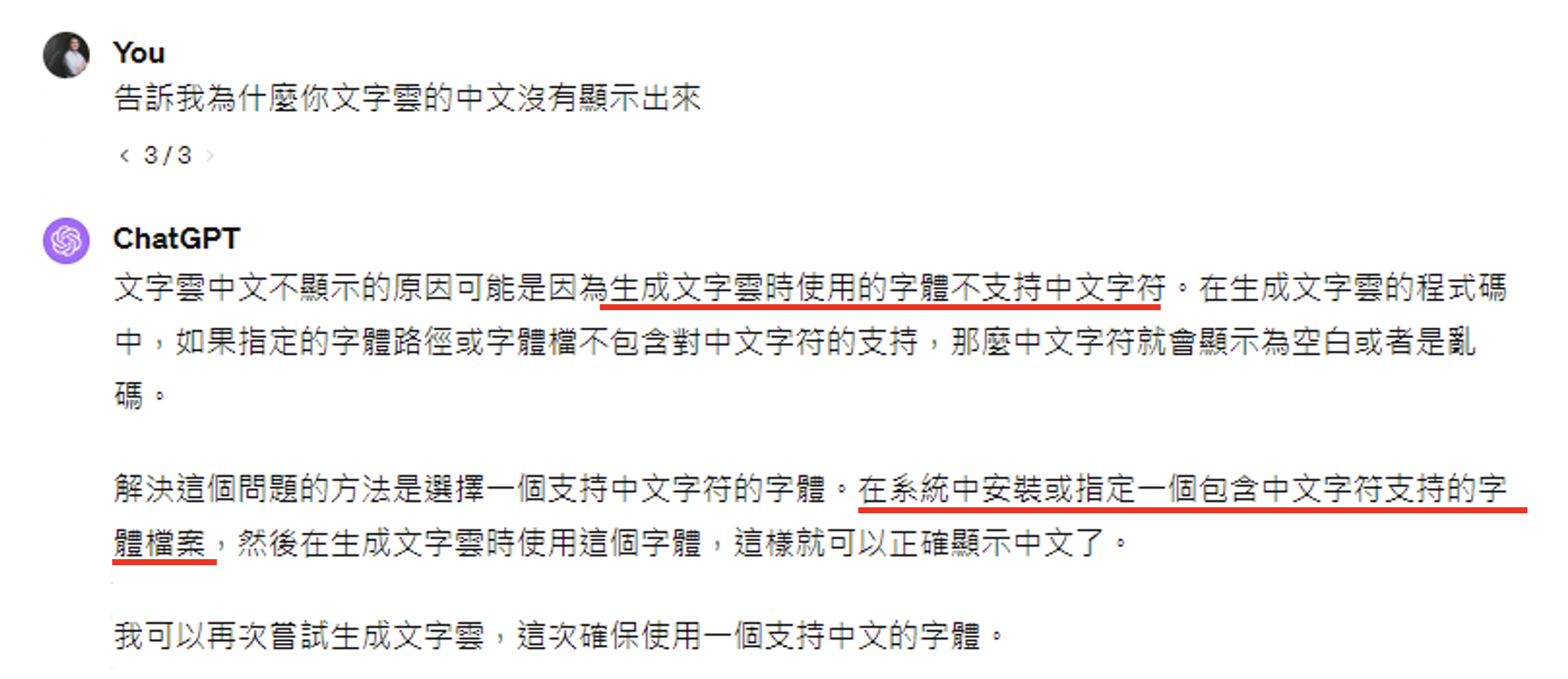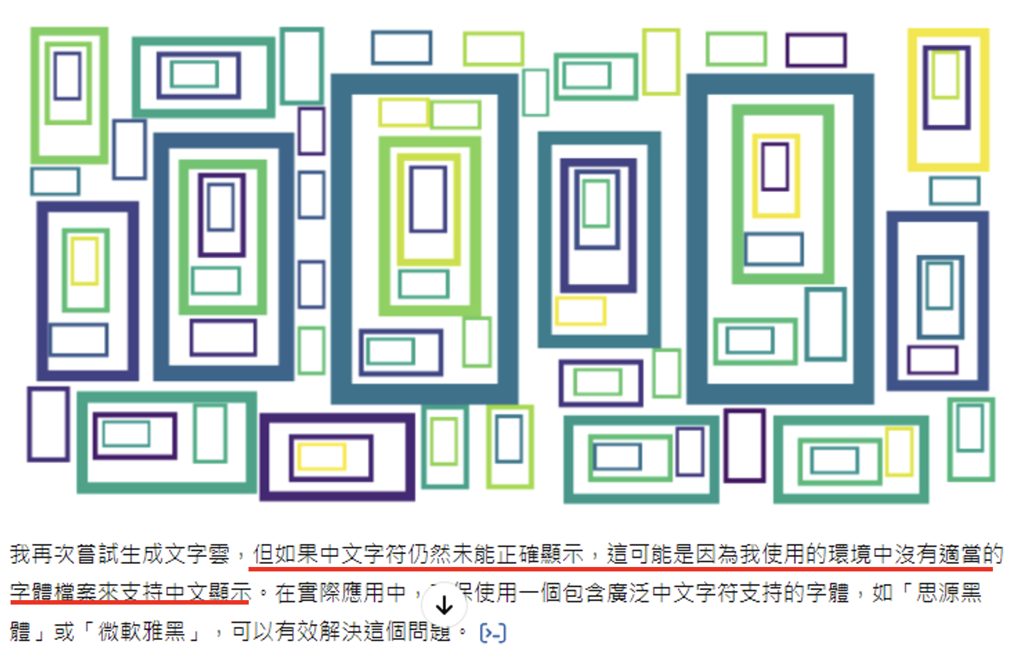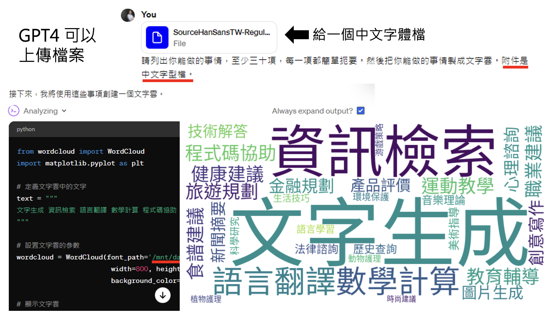 但我们可以主动给 ChatGPT 中文字体文件。现在它就能成功输出正常的词云了。