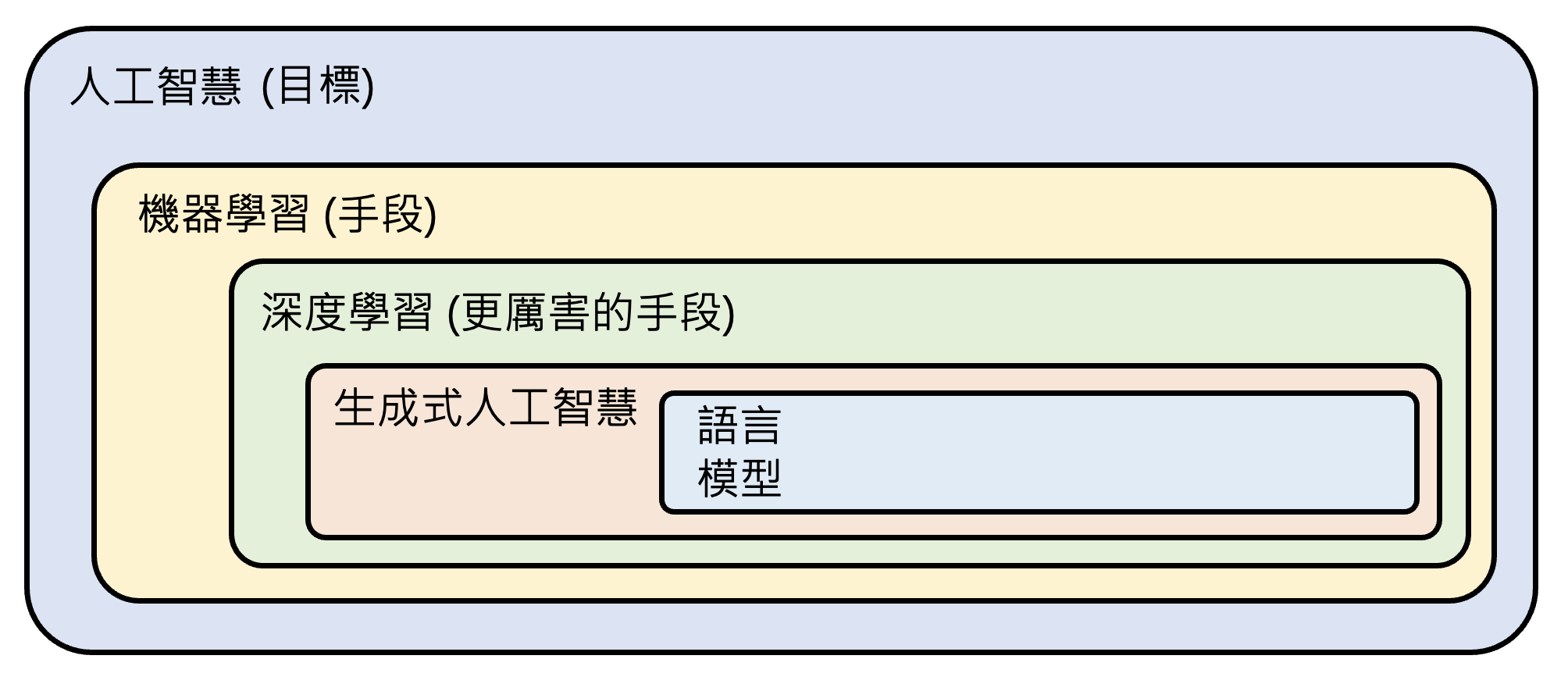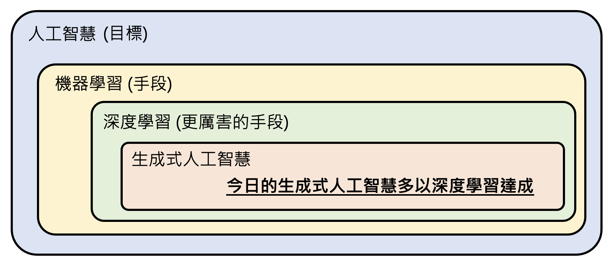 - 现在的生成式 AI:通才、工具人(在某些领域上能力上和人类不相上下,甚至超过人类)