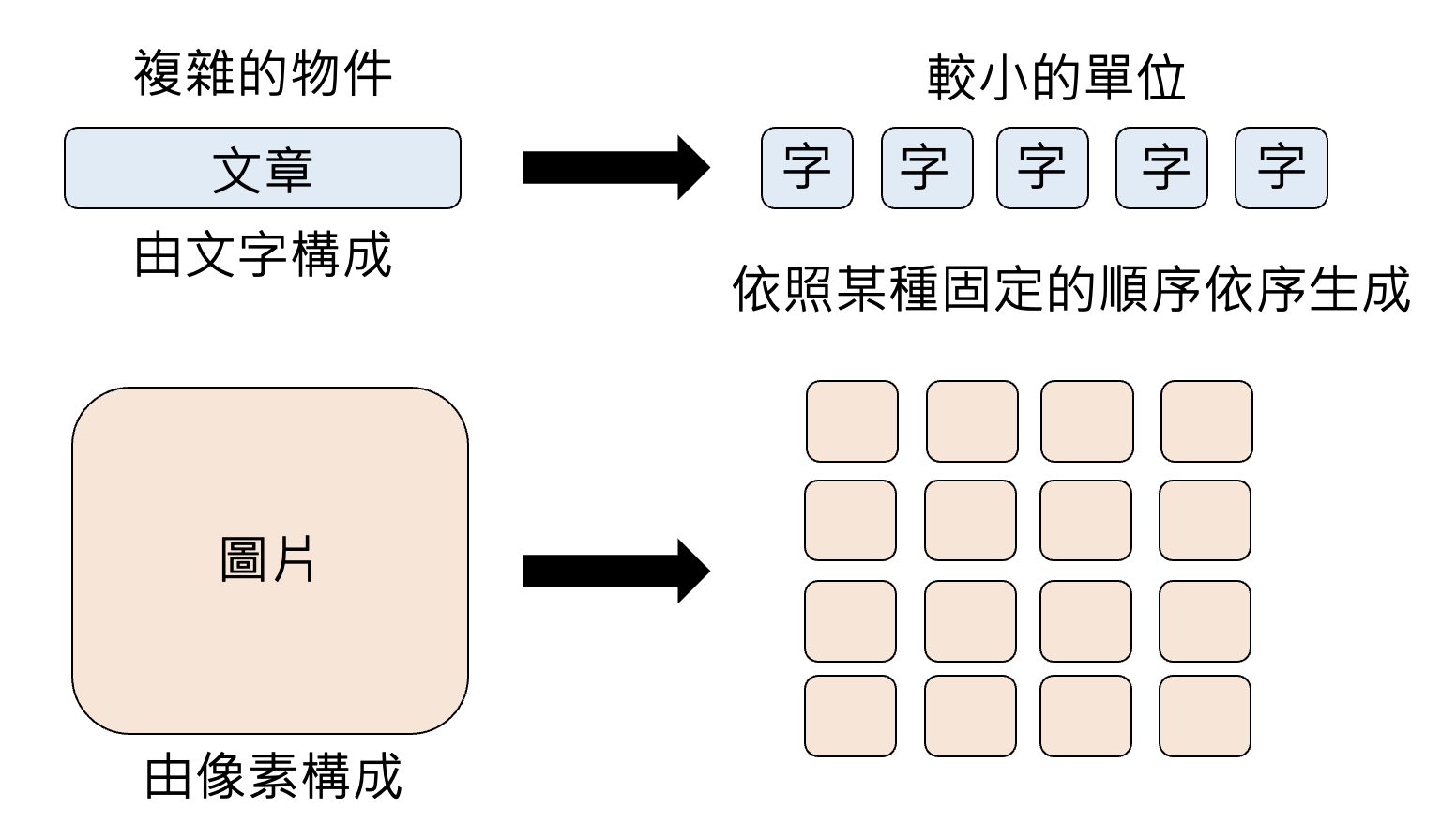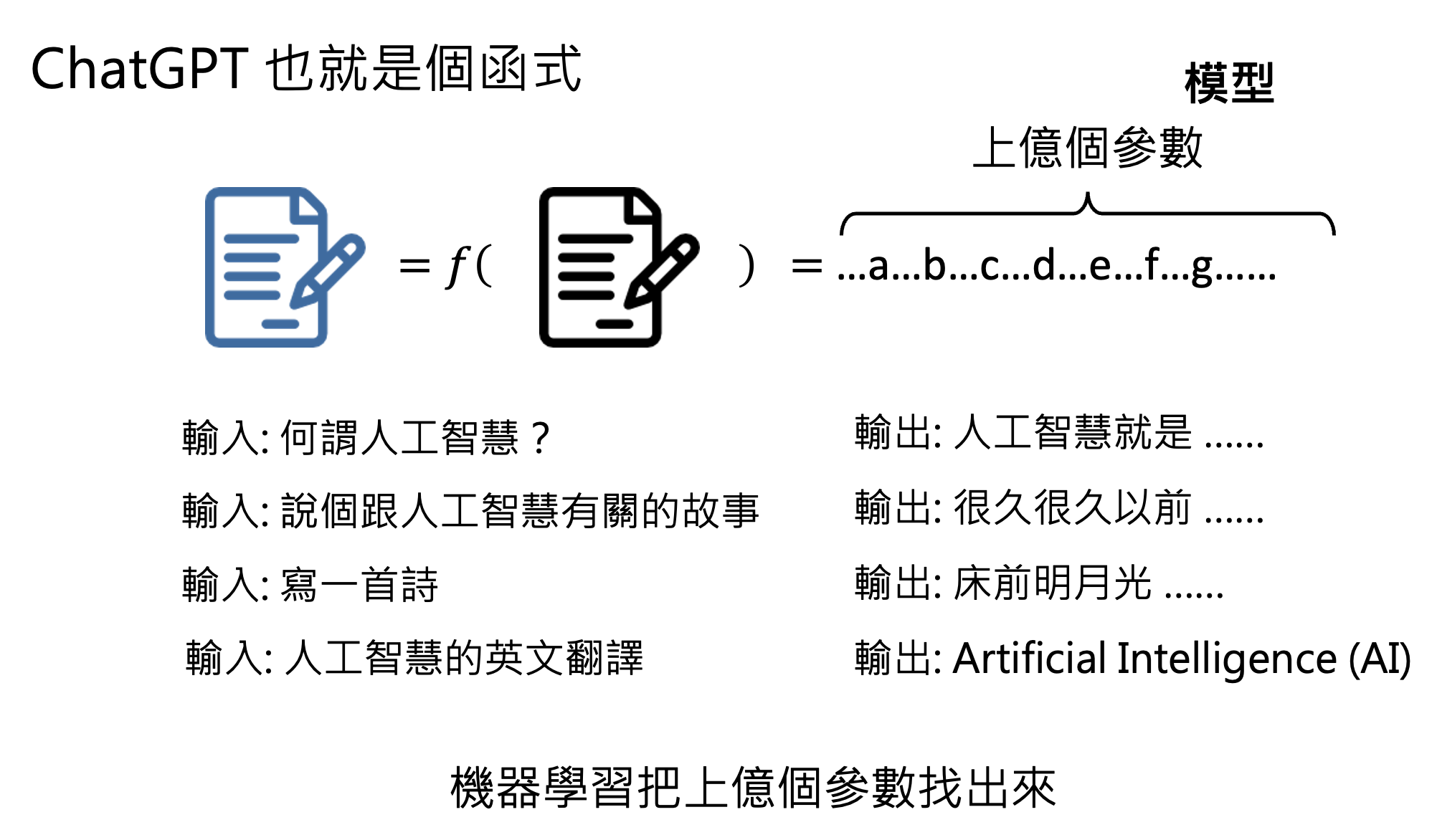 而生成式人工智能(generative AI) 的含义是机器产生复杂的、有结构的对象,比如文本、图像、语音等。概念中的“复杂”具体指无法穷举的可能性,比如让 AI 生成 1 篇 100 字的文章,假设中文常用字有 1000 个,那么就有 \(1000^{100} = 10^{300}\) 种组合,但宇宙中的原子数也就在 \(10^{80}\) 的量级左右。所以生成式 AI 要做的就是从近乎无穷的可能性找出适当的组合。