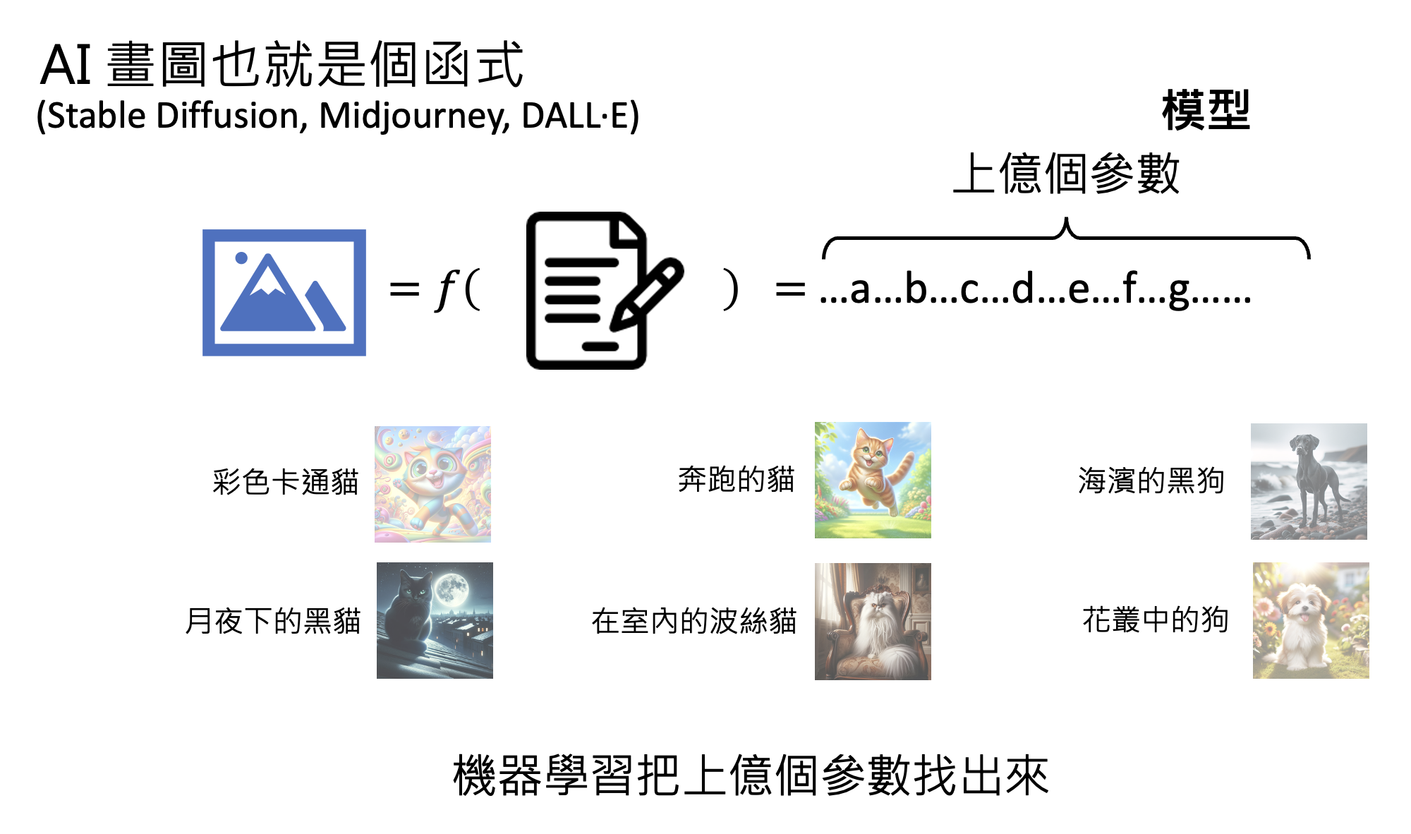 再比如 AI 画图(比如 Stable Diffusion , Midjourney , DALL·E 等)也是可通过机器学习找到的一类“函数”。