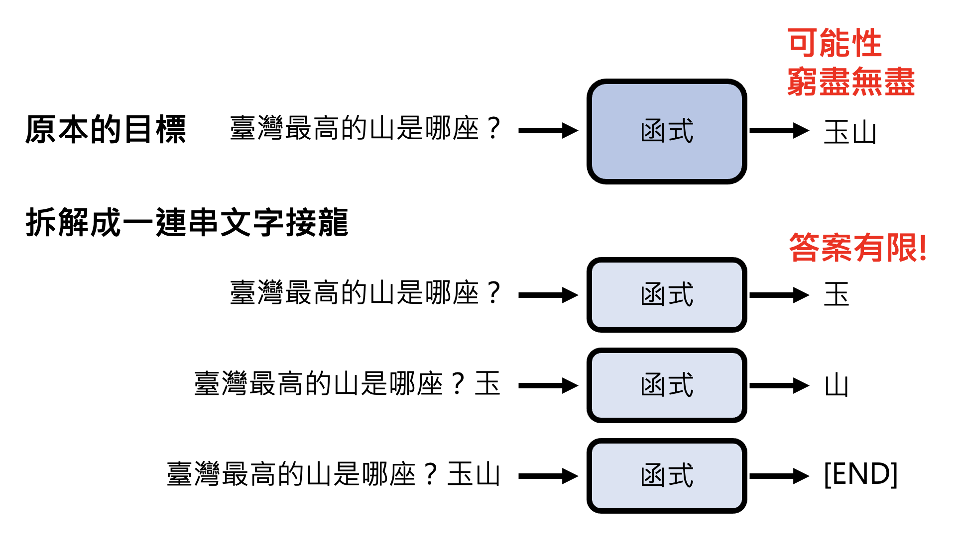 生成式 AI 的挑战在于我们要求机器能够产生在训练时从来没有看过的东西,也就是说让机器具备“创造力”。具体的做法会在之后的课程中详细介绍,这里先简单介绍其中一种思路——让机器做“文字接龙”。它的思想是:将原本的训练任务(文生文)拆解成一连串的文字接龙,也就是说让机器每次只输出有限长度的答案,之后将得到的答案附加在下一次的输入中,让机器接着输出之后的答案。以此类推,直至机器认为可以结束的时候,输出一个特殊符号(比如 [END])表示结束。