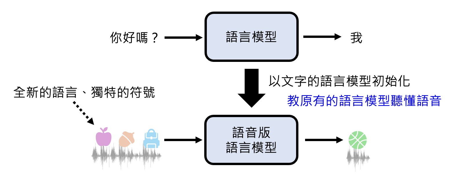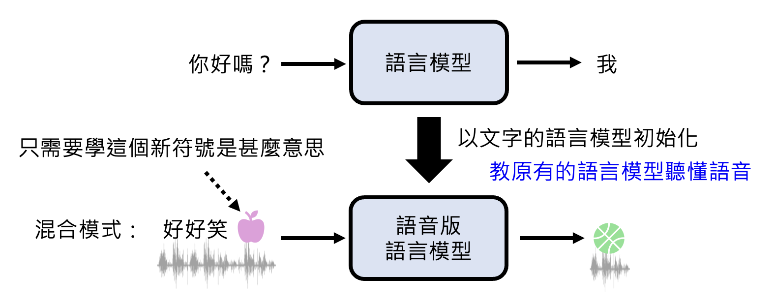 因此一种可能的训练方式是:用一般只看文本的语言模型作为语音版语言模型的初始化参数,之后通过语音数据来调整参数。而它看到的语音单元可以看作是一种独特的符号,来自一门全新的语言体系。