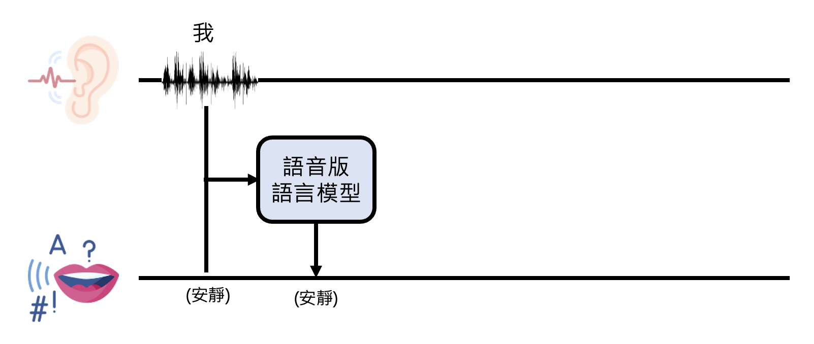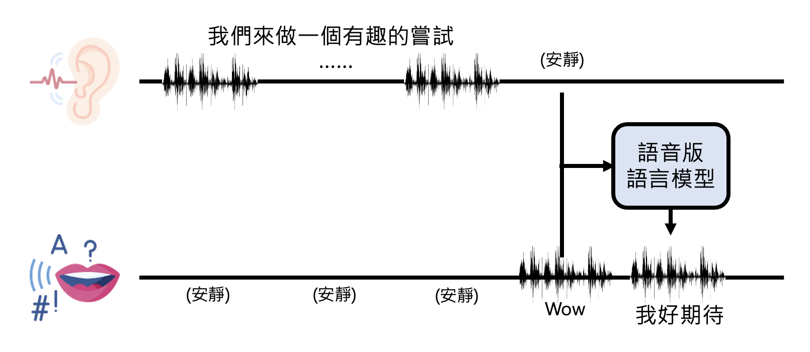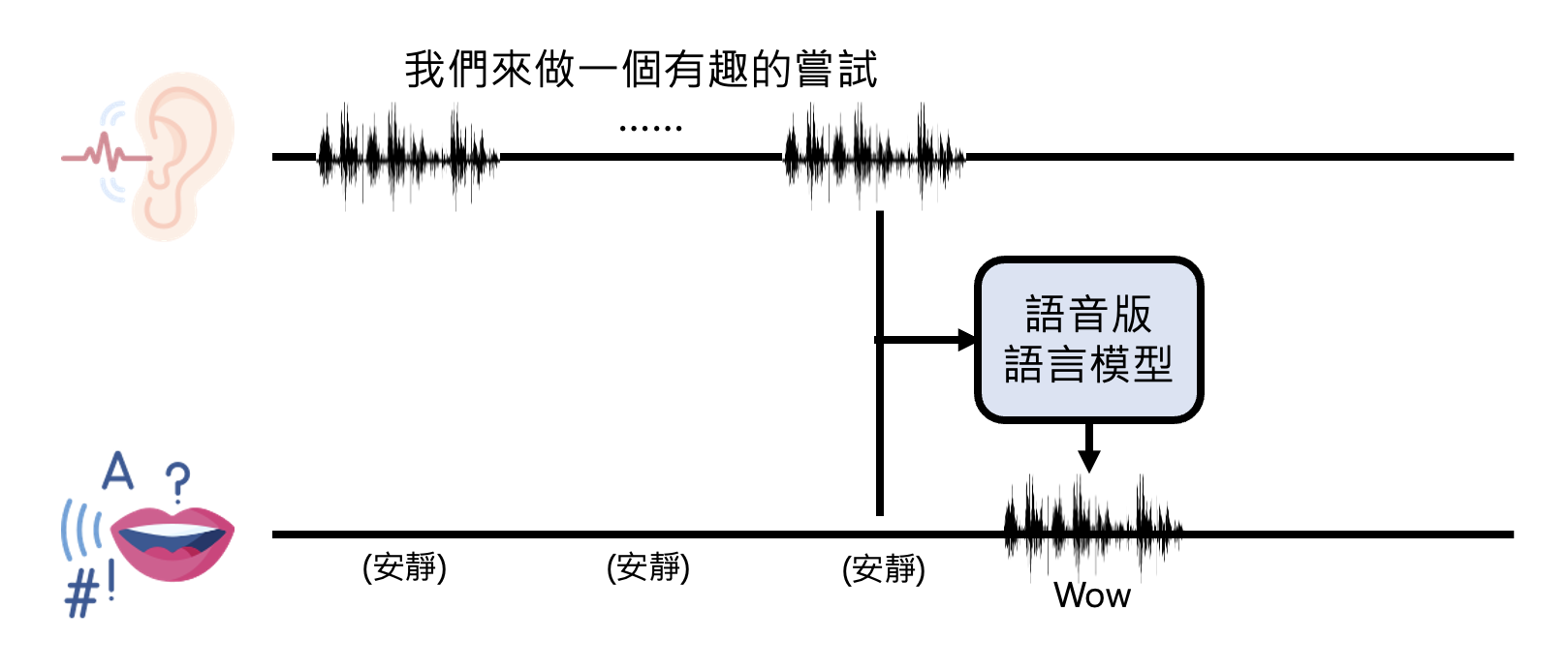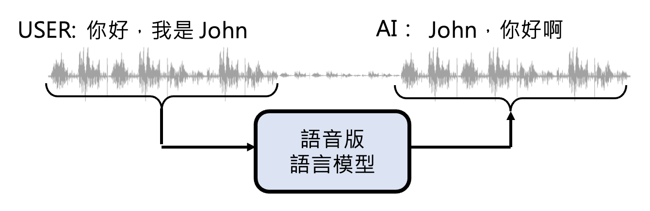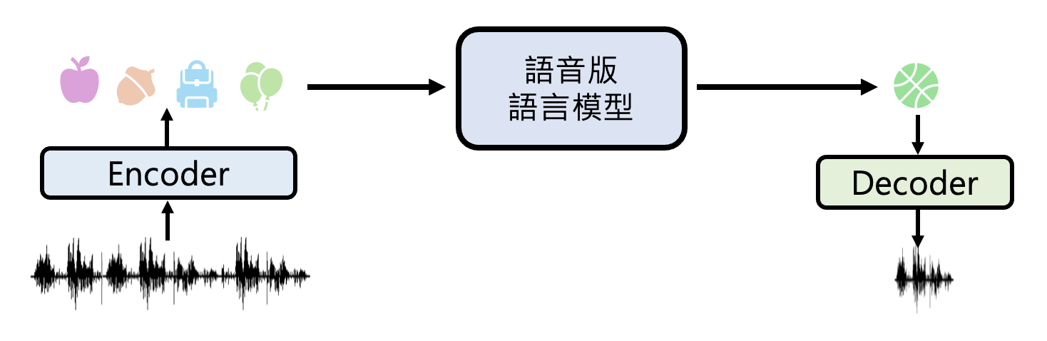 以下是加入编码器和解码器后,语音版语言模型处理语音的流程: