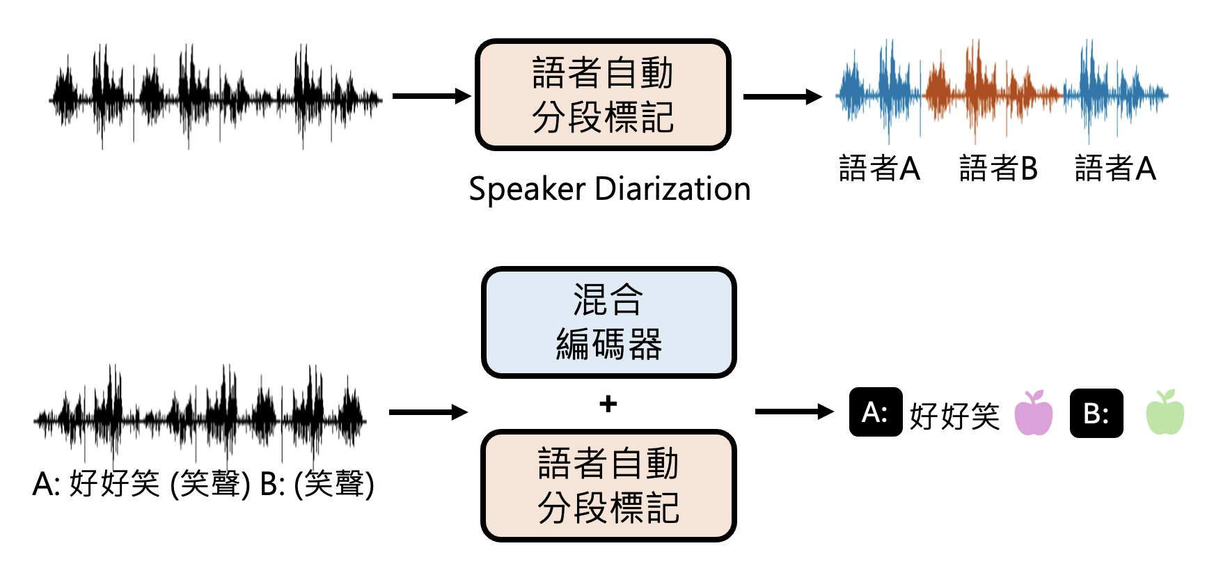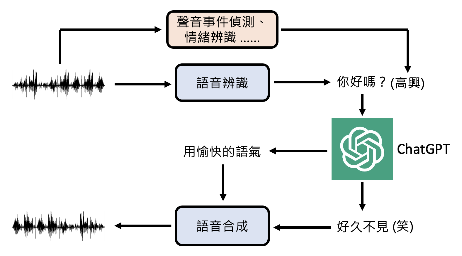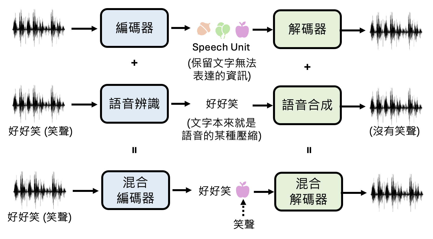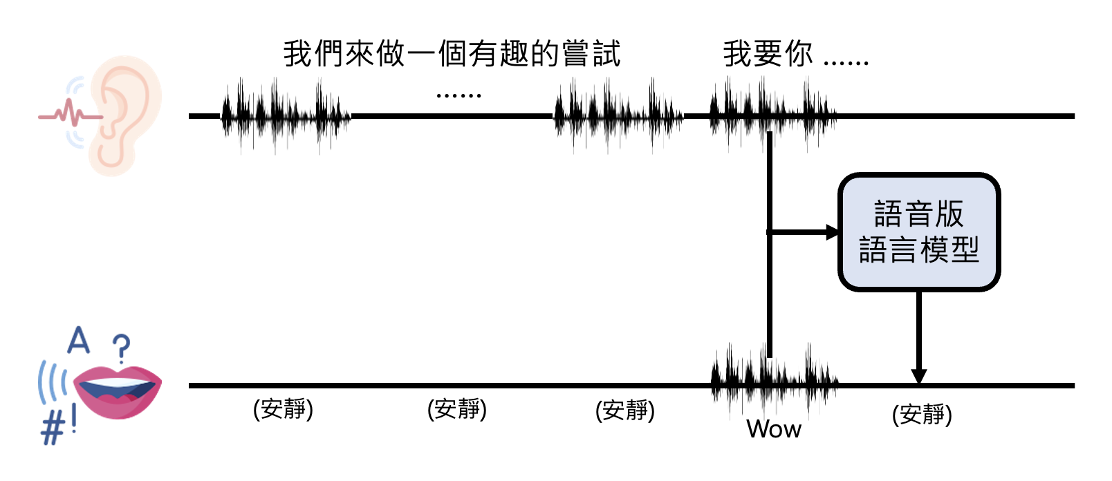 以下是加入编码器和解码器后,语音版语言模型处理语音的流程: