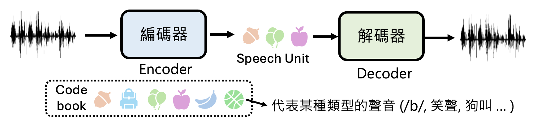 如上图所示,我们还会训练一个叫做解码器的模型,用于将编码重新还原为语音。