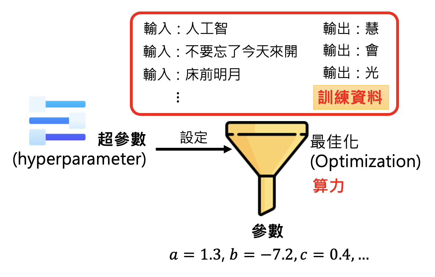 我们知道,训练的过程就是对模型的优化(optimization),而优化的目标就是找到一组好的参数。但有时训练可能会失败(根据已有的训练数据无法找到更好的参数,此时就要重新设定超参数(hyperparameter)(即无法通过训练得到,只能人为设置的参数;人们常说的“调参”中的“参”指的是超参数,然后再次训练。由于训练的时候难免会换多组超参数,不断尝试训练,所以算力的支持在优化中至关重要。