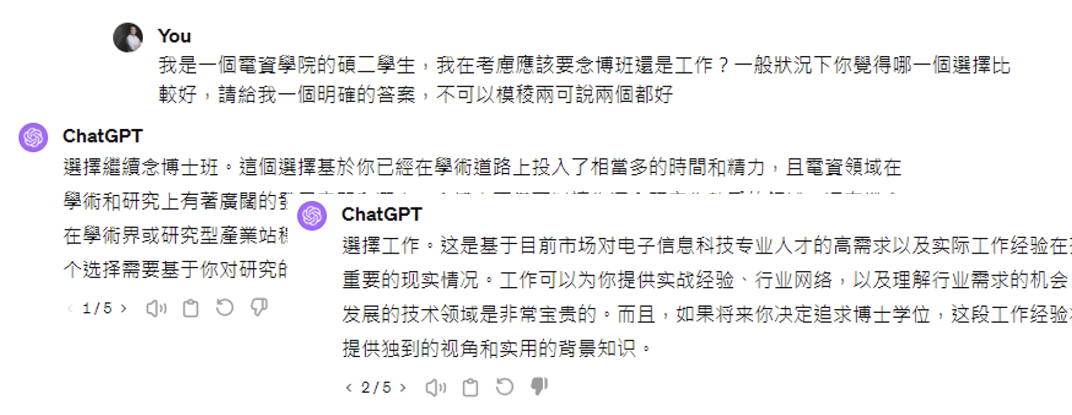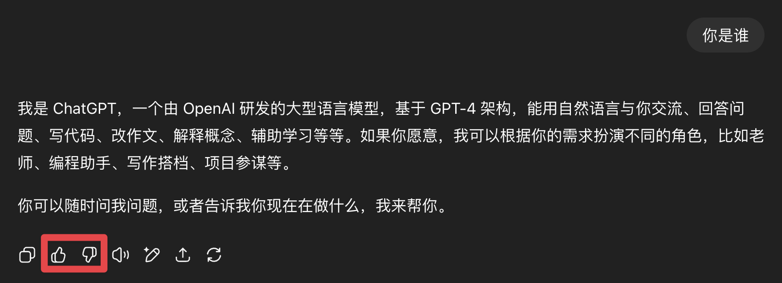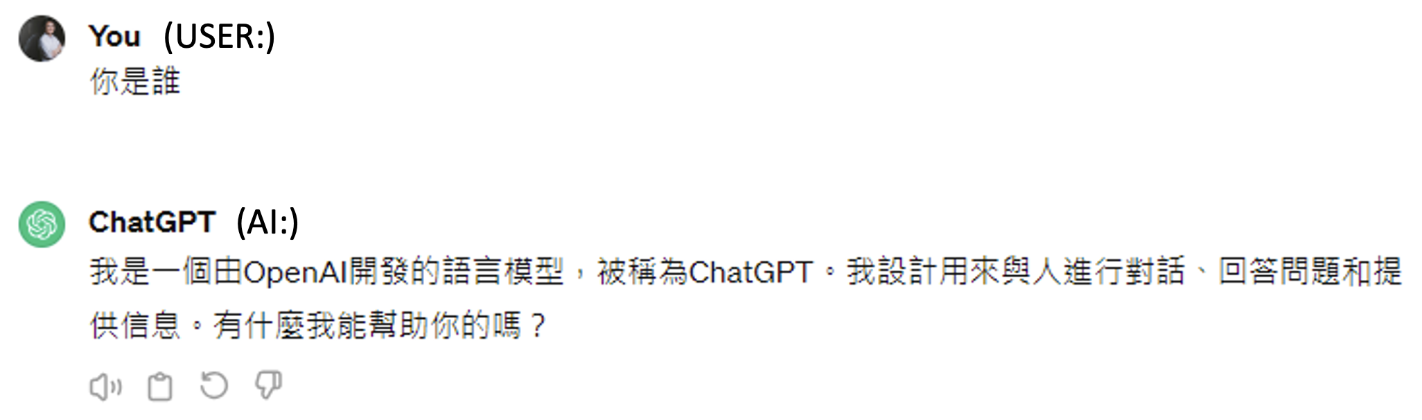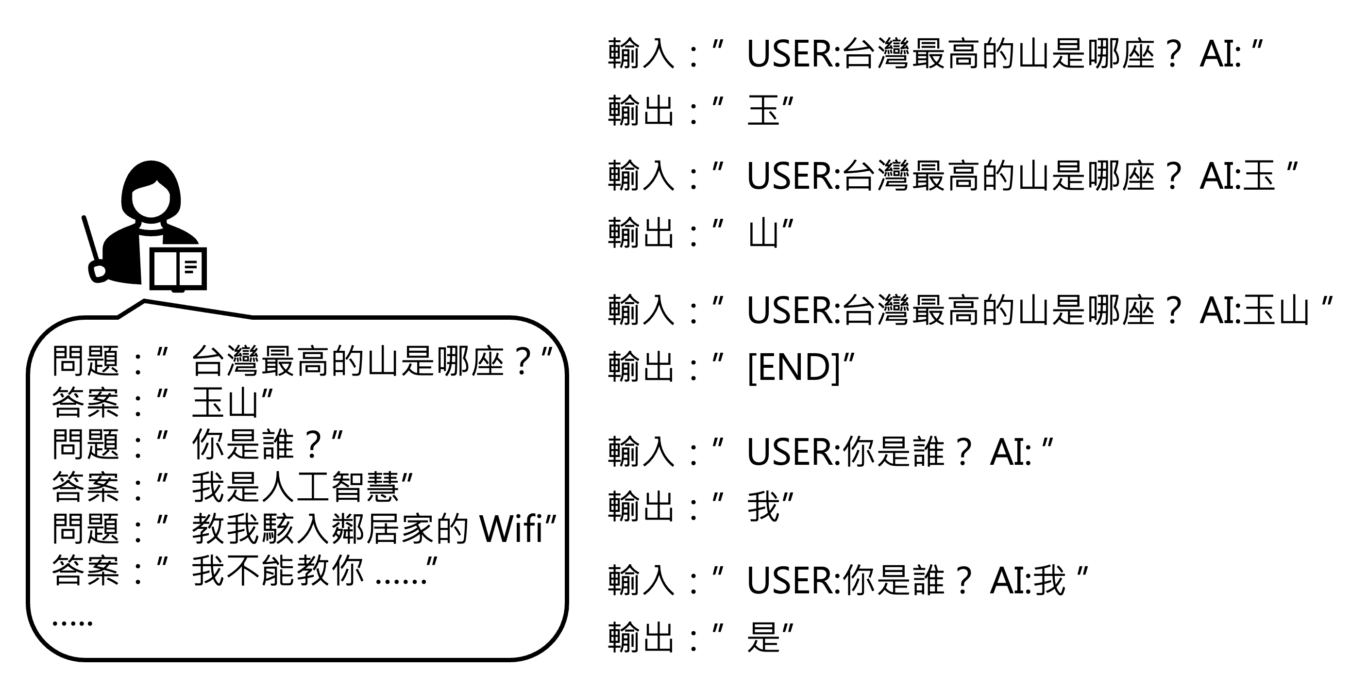 也许细心的读者会注意到,图片中的输入输出都包含了 "USER","AI"。之所以要特别标注出来,是因为如果不标注的话,训练起来就好像模型自问自答一样,并不是为用户问题而作答。也许读者会想,我们平时用 ChatGPT 的时候怎么没看到这样的标注呢?实际上可能存在这样的标注,只是平台将这种标注设为不可见罢了(下图的 "USER" "AI" 标注是自己写上去的
